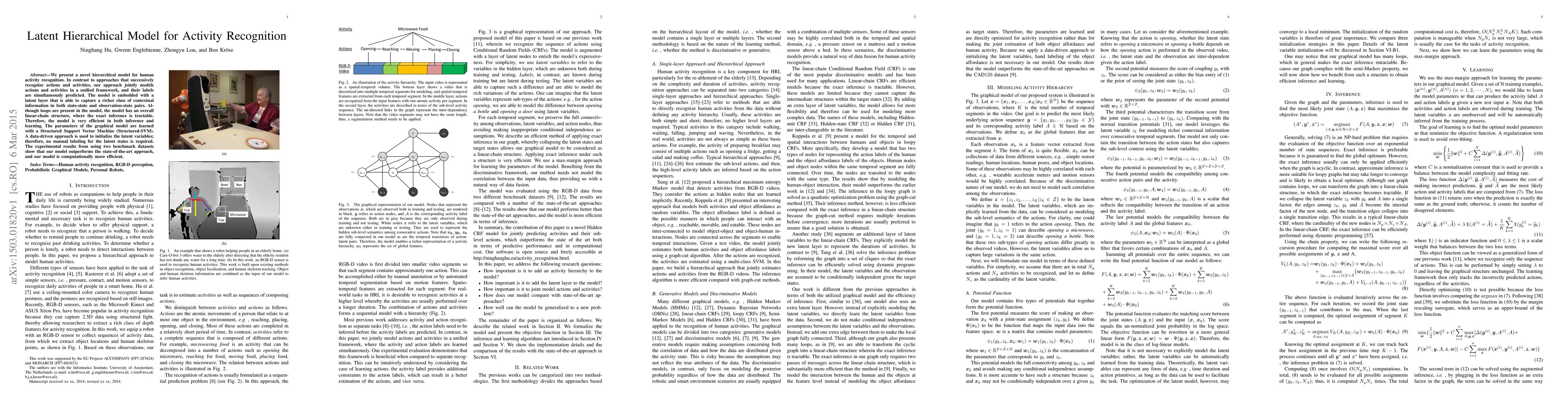 We present a novel hierarchical model for human activity recognition. In contrast to approaches that successively recognize actions and activities, our approach jointly models actions and activities in a unified framework, and their labels are simultaneously predicted. The model is embedded with a latent layer that is able to capture a richer class of contextual information in both state-state and observation-state pairs. Although loops are present in the model, the model has an overall linear-chain structure, where the exact inference is tractable. Therefore, the model is very efficient in both inference and learning. The parameters of the graphical model are learned with a Structured Support Vector Machine (Structured-SVM). A data-driven approach is used to initialize the latent variables; therefore, no manual labeling for the latent states is required. The experimental results from using two benchmark datasets show that our model outperforms the state-of-the-art approach, and our model is computationally more efficient.