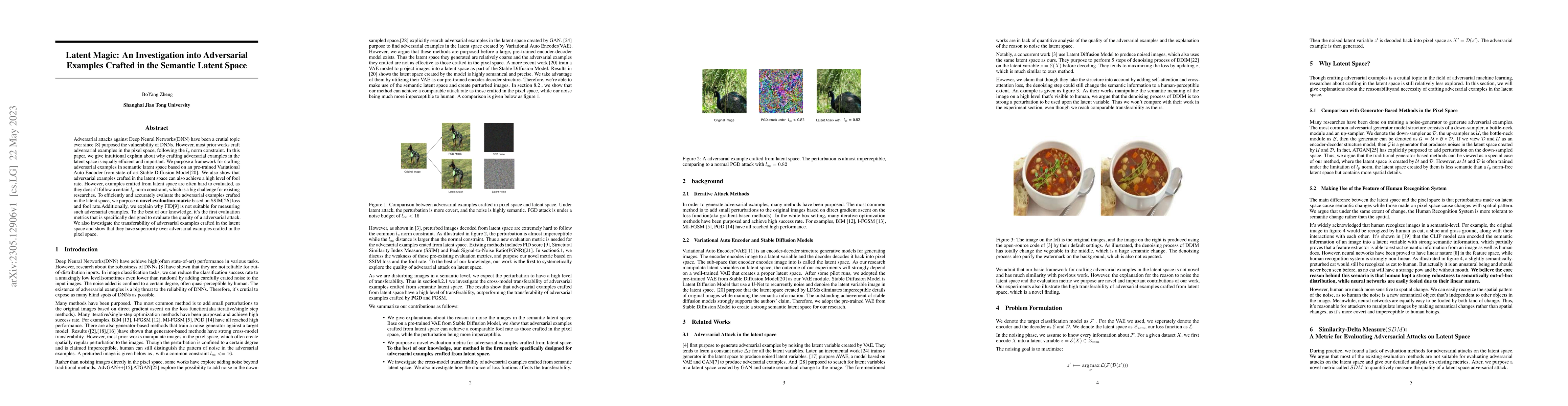 Adversarial attacks against Deep Neural Networks(DNN) have been a crutial topic ever since \cite{goodfellow} purposed the vulnerability of DNNs. However, most prior works craft adversarial examples in the pixel space, following the $l_p$ norm constraint. In this paper, we give intuitional explain about why crafting adversarial examples in the latent space is equally efficient and important. We purpose a framework for crafting adversarial examples in semantic latent space based on an pre-trained Variational Auto Encoder from state-of-art Stable Diffusion Model\cite{SDM}. We also show that adversarial examples crafted in the latent space can also achieve a high level of fool rate. However, examples crafted from latent space are often hard to evaluated, as they doesn't follow a certain $l_p$ norm constraint, which is a big challenge for existing researches. To efficiently and accurately evaluate the adversarial examples crafted in the latent space, we purpose \textbf{a novel evaluation matric} based on SSIM\cite{SSIM} loss and fool rate.Additionally, we explain why FID\cite{FID} is not suitable for measuring such adversarial examples. To the best of our knowledge, it's the first evaluation metrics that is specifically designed to evaluate the quality of a adversarial attack. We also investigate the transferability of adversarial examples crafted in the latent space and show that they have superiority over adversarial examples crafted in the pixel space.
