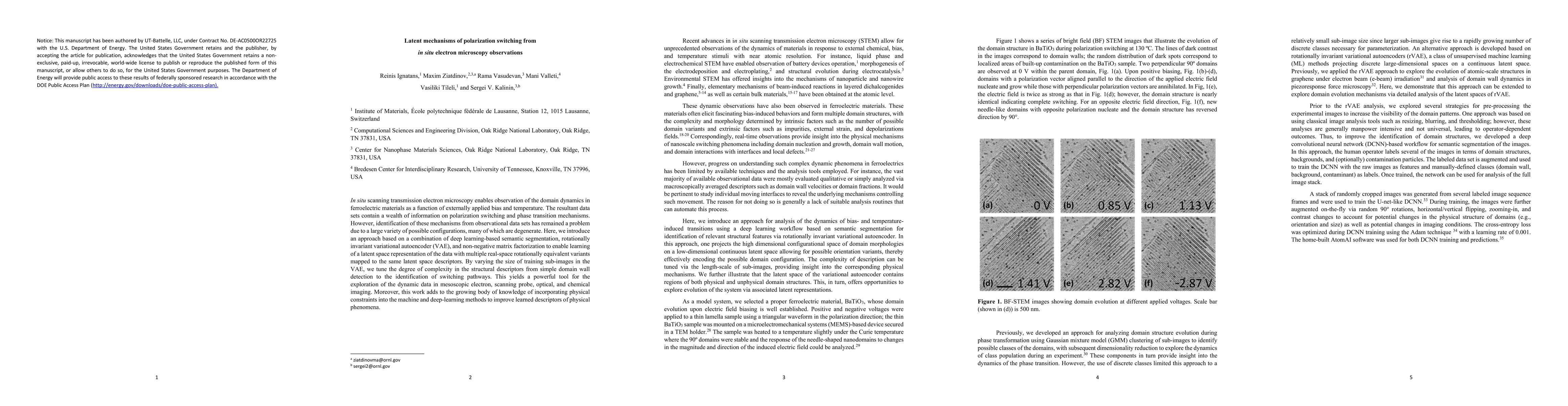 This paper introduces a rotationally invariant variational autoencoder (VAE) to analyze in situ electron microscopy data, enabling the identification of latent mechanisms in polarization switching and phase transitions in ferroelectric materials. The approach maps multiple rotationally equivalent configurations to the same latent descriptors, facilitating the exploration of complex domain dynamics.