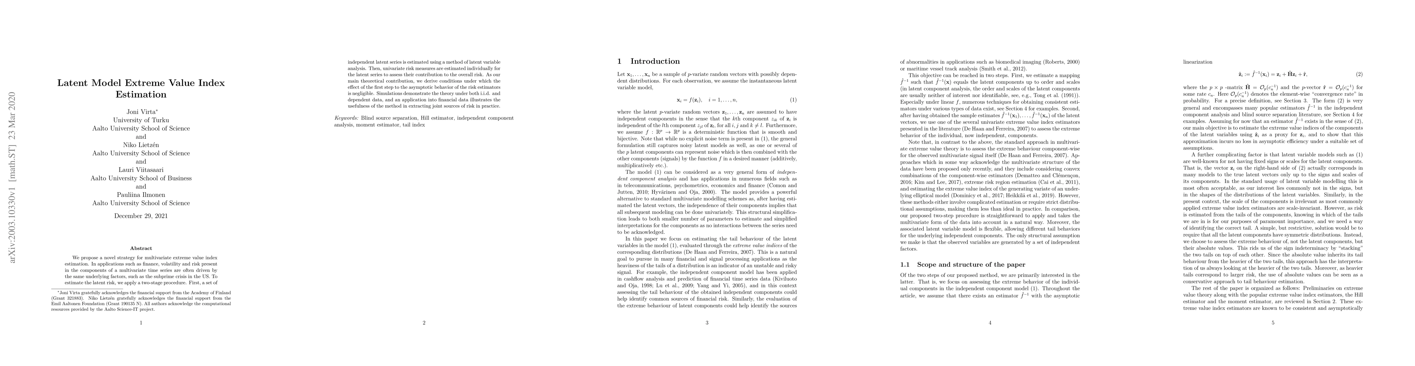 This paper introduces a two-stage method for estimating the multivariate extreme value index, focusing on latent risk factors in financial time series. It uses latent variable analysis to extract independent latent series and assesses their risk contributions, proving the negligible effect of the first step on the asymptotic behavior of risk estimators.