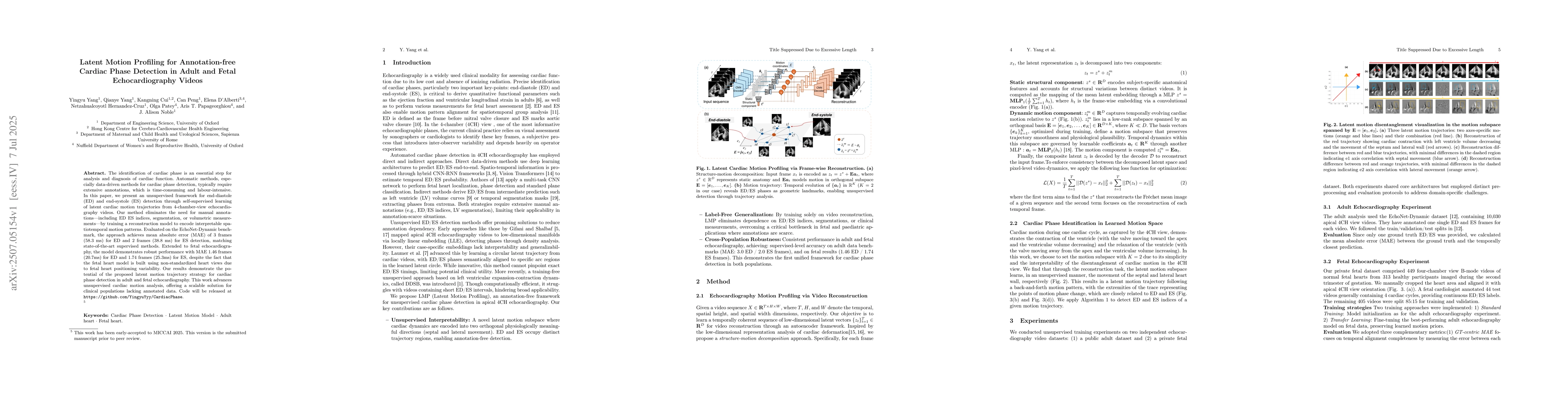 The identification of cardiac phase is an essential step for analysis and diagnosis of cardiac function. Automatic methods, especially data-driven methods for cardiac phase detection, typically require extensive annotations, which is time-consuming and labor-intensive. In this paper, we present an unsupervised framework for end-diastole (ED) and end-systole (ES) detection through self-supervised learning of latent cardiac motion trajectories from 4-chamber-view echocardiography videos. Our method eliminates the need for manual annotations, including ED and ES indices, segmentation, or volumetric measurements, by training a reconstruction model to encode interpretable spatiotemporal motion patterns. Evaluated on the EchoNet-Dynamic benchmark, the approach achieves mean absolute error (MAE) of 3 frames (58.3 ms) for ED and 2 frames (38.8 ms) for ES detection, matching state-of-the-art supervised methods. Extended to fetal echocardiography, the model demonstrates robust performance with MAE 1.46 frames (20.7 ms) for ED and 1.74 frames (25.3 ms) for ES, despite the fact that the fetal heart model is built using non-standardized heart views due to fetal heart positioning variability. Our results demonstrate the potential of the proposed latent motion trajectory strategy for cardiac phase detection in adult and fetal echocardiography. This work advances unsupervised cardiac motion analysis, offering a scalable solution for clinical populations lacking annotated data. Code will be released at https://github.com/YingyuYyy/CardiacPhase.