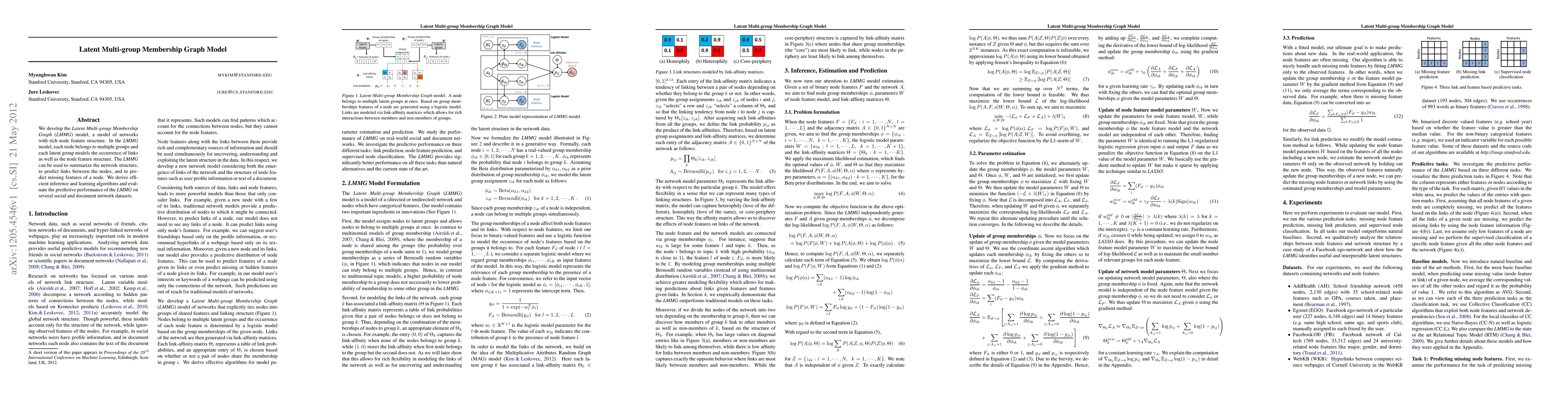 The Latent Multi-group Membership Graph Model (LMMG) is a new model that can summarize network structure, predict links between nodes, and fill in missing features. It was evaluated on social and document networks with promising results.