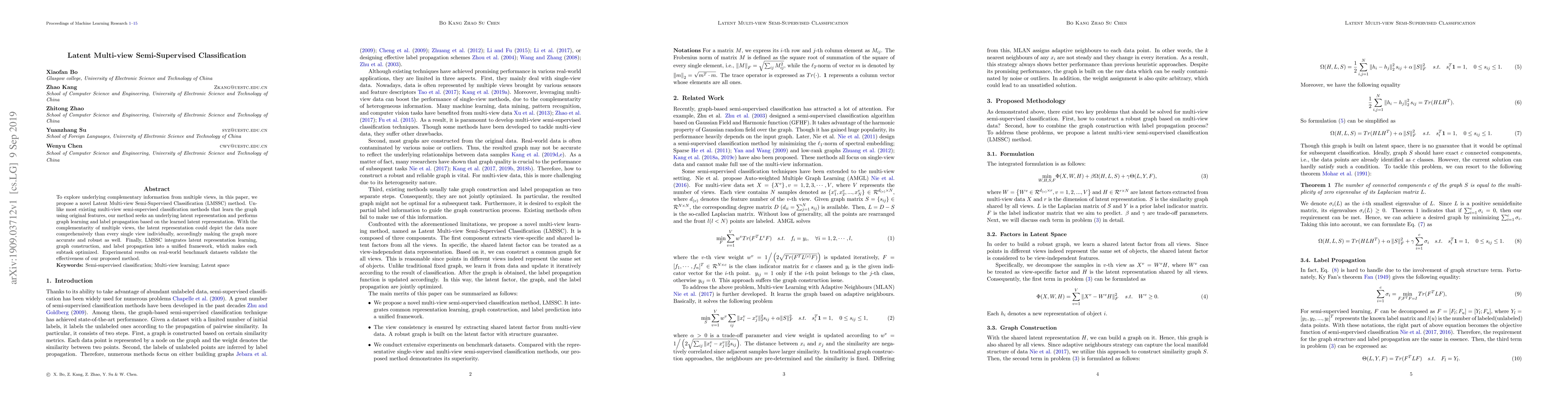 This paper proposes a novel Latent Multi-view Semi-Supervised Classification (LMSSC) method that learns an underlying latent representation from multiple views to enhance graph learning and label propagation. The method demonstrates improved accuracy and robustness compared to existing methods, as validated by experiments on real-world datasets.