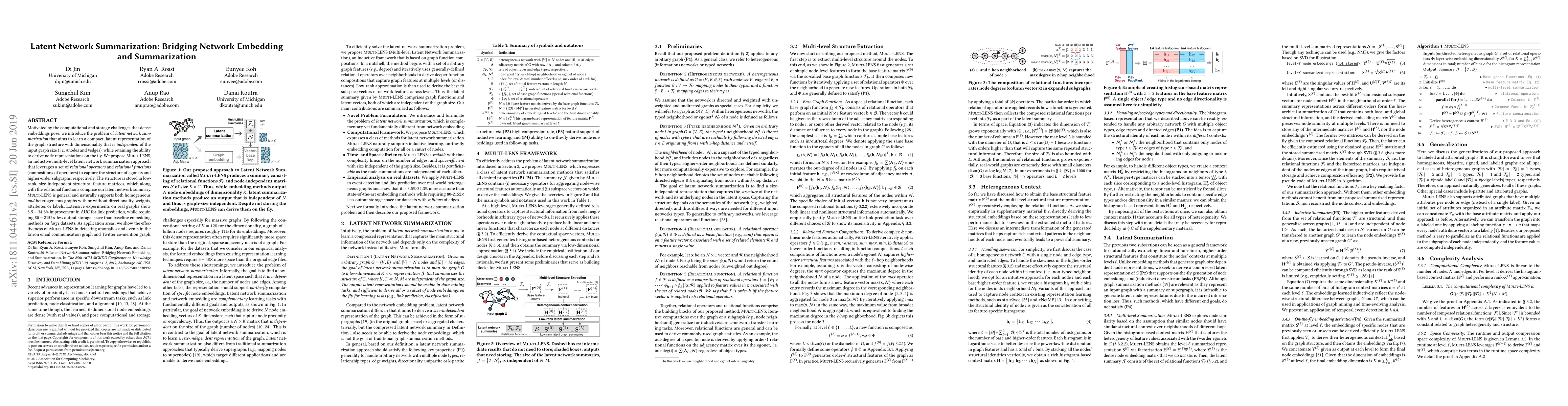Motivated by the computational and storage challenges that dense embeddings pose, we introduce the problem of latent network summarization that aims to learn a compact, latent representation of the graph structure with dimensionality that is independent of the input graph size (i.e., #nodes and #edges), while retaining the ability to derive node representations on the fly. We propose Multi-LENS, an inductive multi-level latent network summarization approach that leverages a set of relational operators and relational functions (compositions of operators) to capture the structure of egonets and higher-order subgraphs, respectively. The structure is stored in low-rank, size-independent structural feature matrices, which along with the relational functions comprise our latent network summary. Multi-LENS is general and naturally supports both homogeneous and heterogeneous graphs with or without directionality, weights, attributes or labels. Extensive experiments on real graphs show 3.5 - 34.3% improvement in AUC for link prediction, while requiring 80 - 2152x less output storage space than baseline embedding methods on large datasets. As application areas, we show the effectiveness of Multi-LENS in detecting anomalies and events in the Enron email communication graph and Twitter co-mention graph.
