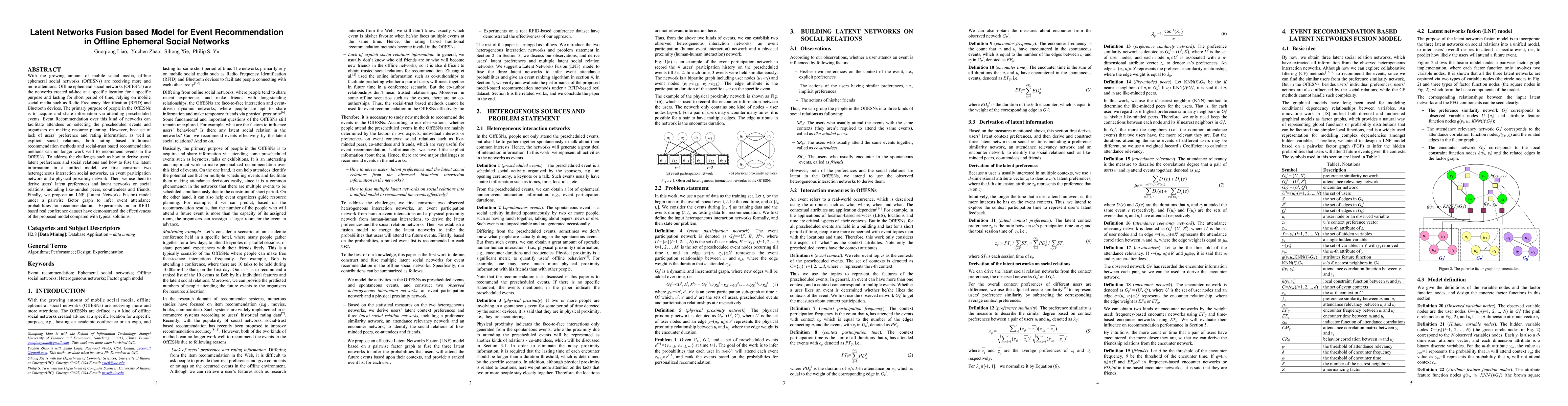 This paper proposes a Latent Networks Fusion (LNF) model for event recommendation in offline ephemeral social networks (OffESNs), leveraging heterogeneous interaction networks to infer users' latent preferences and social relations. The model effectively recommends events by fusing latent information, demonstrating superior performance over traditional methods in an RFID-based real conference dataset.
