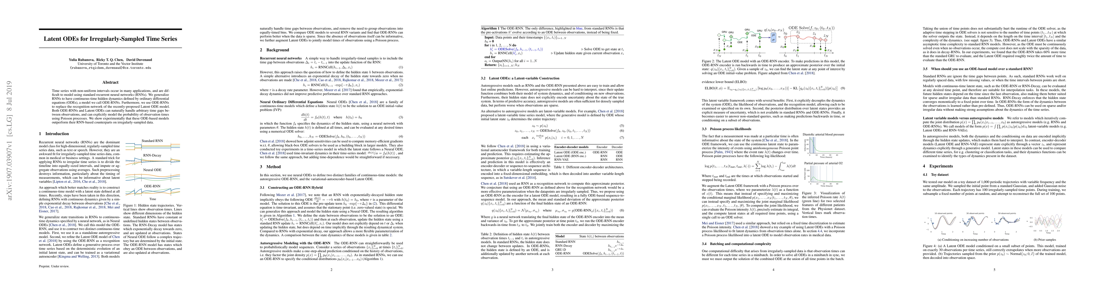 This paper proposes ODE-RNNs, a generalization of RNNs using ordinary differential equations for continuous-time hidden dynamics, and applies it to the Latent ODE model to handle irregularly-sampled time series data. Experimental results show that ODE-based models outperform traditional RNNs on such data.
