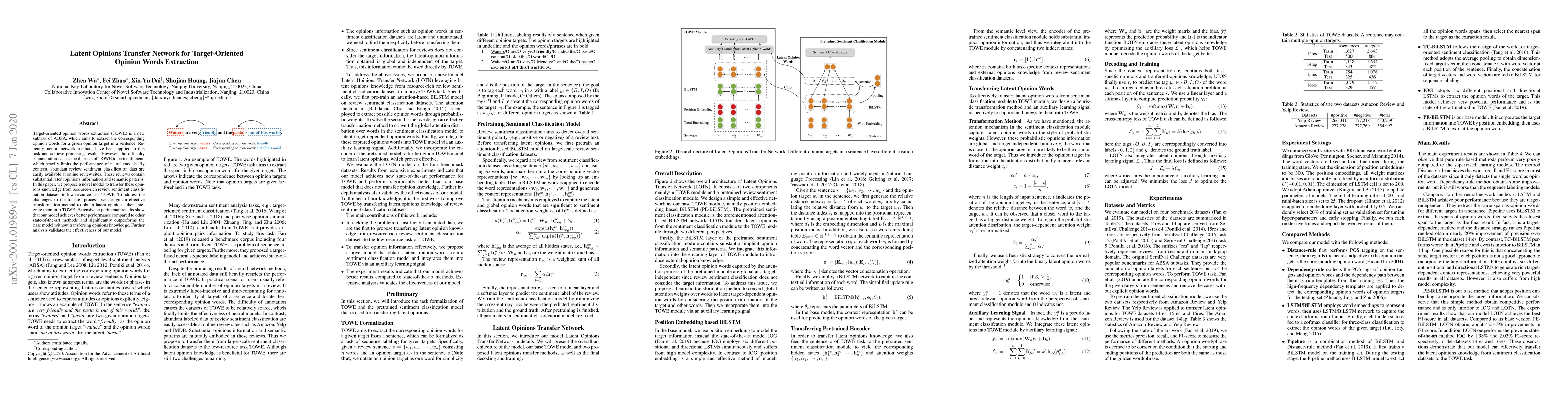This paper proposes a Latent Opinions Transfer Network to enhance target-oriented opinion words extraction (TOWE) by leveraging abundant review sentiment classification data. The model effectively transfers latent opinions from resource-rich sentiment datasets to improve TOWE performance, achieving superior results compared to existing methods.