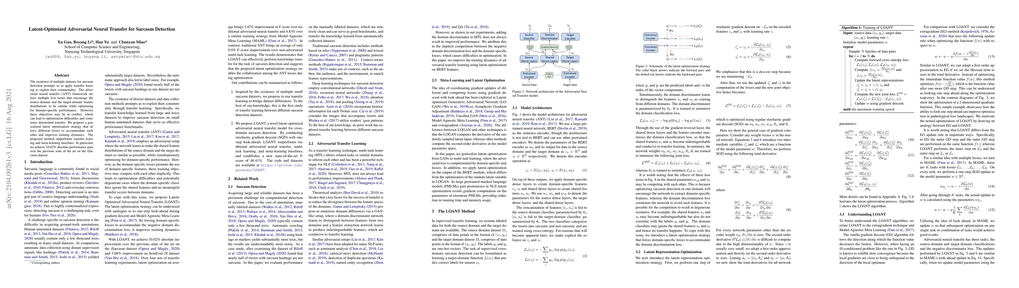 The existence of multiple datasets for sarcasm detection prompts us to apply transfer learning to exploit their commonality. The adversarial neural transfer (ANT) framework utilizes multiple loss terms that encourage the source-domain and the target-domain feature distributions to be similar while optimizing for domain-specific performance. However, these objectives may be in conflict, which can lead to optimization difficulties and sometimes diminished transfer. We propose a generalized latent optimization strategy that allows different losses to accommodate each other and improves training dynamics. The proposed method outperforms transfer learning and meta-learning baselines. In particular, we achieve 10.02% absolute performance gain over the previous state of the art on the iSarcasm dataset.