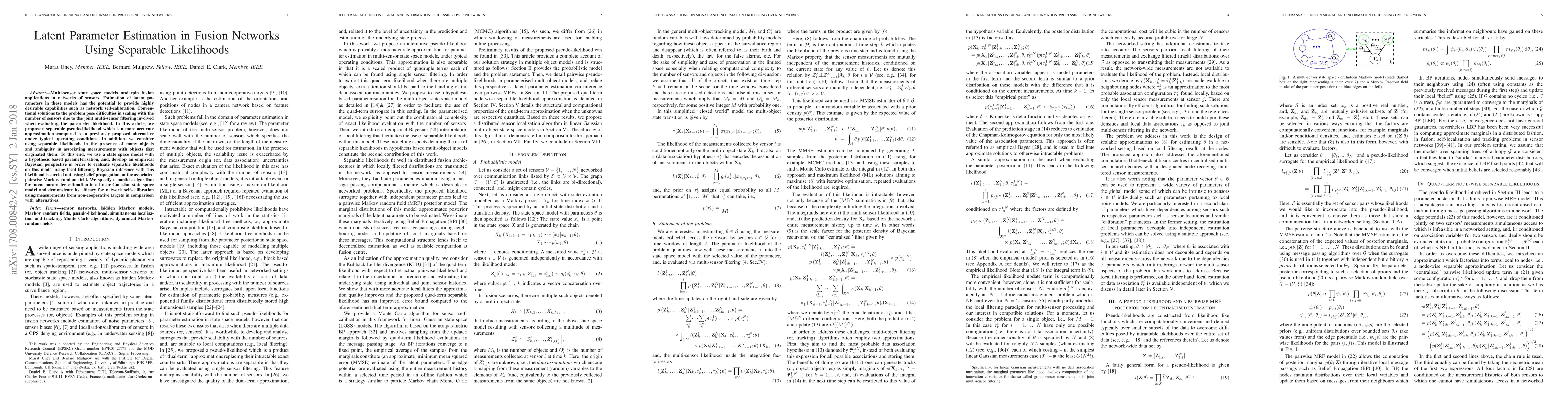 Multi-sensor state space models underpin fusion applications in networks of sensors. Estimation of latent parameters in these models has the potential to provide highly desirable capabilities such as network self-calibration. Conventional solutions to the problem pose difficulties in scaling with the number of sensors due to the joint multi-sensor filtering involved when evaluating the parameter likelihood. In this article, we propose a separable pseudo-likelihood which is a more accurate approximation compared to a previously proposed alternative under typical operating conditions. In addition, we consider using separable likelihoods in the presence of many objects and ambiguity in associating measurements with objects that originated them. To this end, we use a state space model with a hypothesis based parameterisation, and, develop an empirical Bayesian perspective in order to evaluate separable likelihoods on this model using local filtering. Bayesian inference with this likelihood is carried out using belief propagation on the associated pairwise Markov random field. We specify a particle algorithm for latent parameter estimation in a linear Gaussian state space model and demonstrate its efficacy for network self-calibration using measurements from non-cooperative targets in comparison with alternatives.