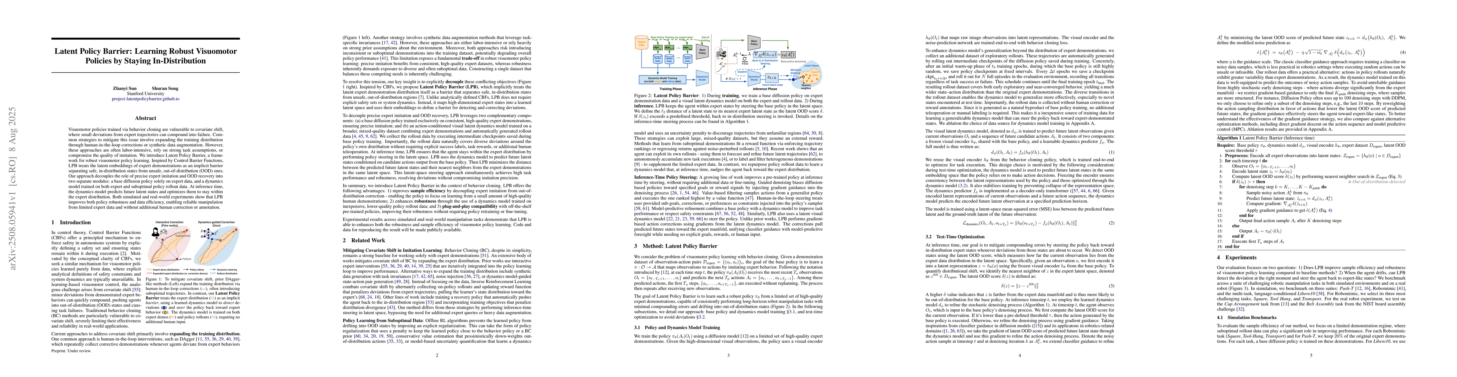 Visuomotor policies trained via behavior cloning are vulnerable to covariate shift, where small deviations from expert trajectories can compound into failure. Common strategies to mitigate this issue involve expanding the training distribution through human-in-the-loop corrections or synthetic data augmentation. However, these approaches are often labor-intensive, rely on strong task assumptions, or compromise the quality of imitation. We introduce Latent Policy Barrier, a framework for robust visuomotor policy learning. Inspired by Control Barrier Functions, LPB treats the latent embeddings of expert demonstrations as an implicit barrier separating safe, in-distribution states from unsafe, out-of-distribution (OOD) ones. Our approach decouples the role of precise expert imitation and OOD recovery into two separate modules: a base diffusion policy solely on expert data, and a dynamics model trained on both expert and suboptimal policy rollout data. At inference time, the dynamics model predicts future latent states and optimizes them to stay within the expert distribution. Both simulated and real-world experiments show that LPB improves both policy robustness and data efficiency, enabling reliable manipulation from limited expert data and without additional human correction or annotation.