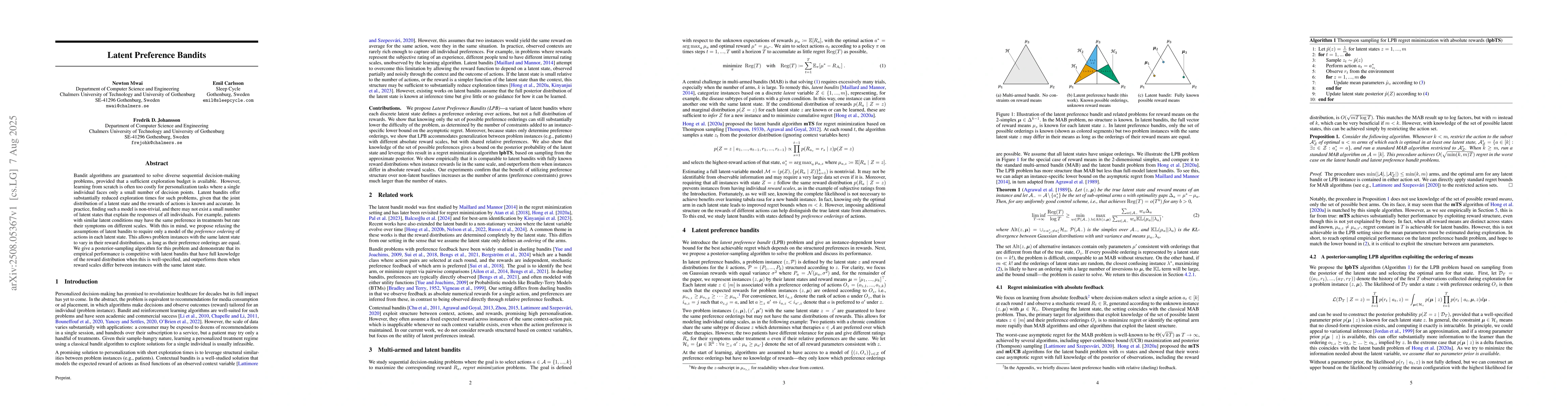 Bandit algorithms are guaranteed to solve diverse sequential decision-making problems, provided that a sufficient exploration budget is available. However, learning from scratch is often too costly for personalization tasks where a single individual faces only a small number of decision points. Latent bandits offer substantially reduced exploration times for such problems, given that the joint distribution of a latent state and the rewards of actions is known and accurate. In practice, finding such a model is non-trivial, and there may not exist a small number of latent states that explain the responses of all individuals. For example, patients with similar latent conditions may have the same preference in treatments but rate their symptoms on different scales. With this in mind, we propose relaxing the assumptions of latent bandits to require only a model of the \emph{preference ordering} of actions in each latent state. This allows problem instances with the same latent state to vary in their reward distributions, as long as their preference orderings are equal. We give a posterior-sampling algorithm for this problem and demonstrate that its empirical performance is competitive with latent bandits that have full knowledge of the reward distribution when this is well-specified, and outperforms them when reward scales differ between instances with the same latent state.