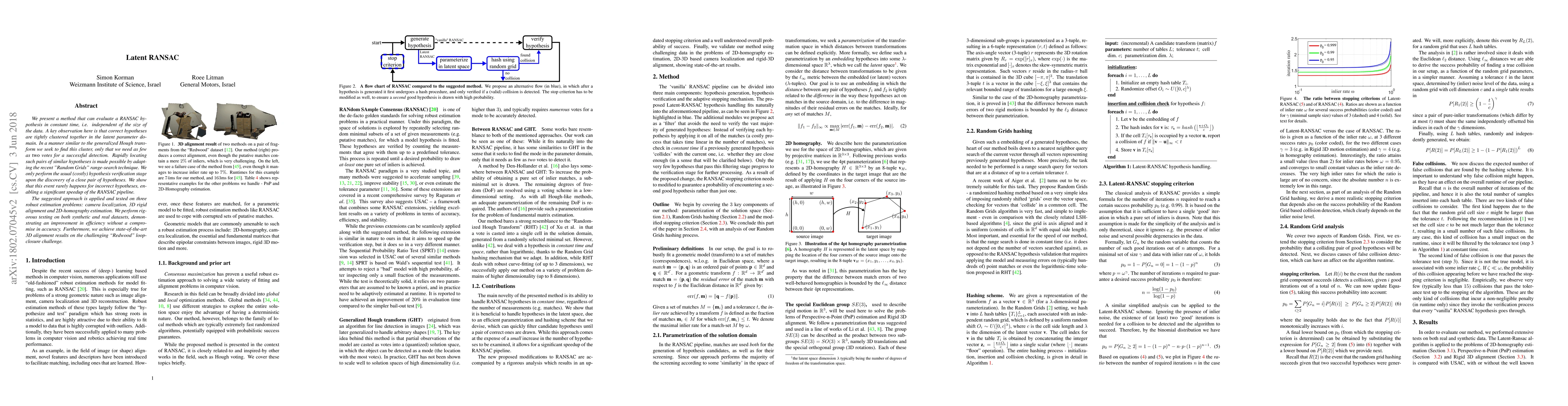 Latent RANSAC evaluates RANSAC hypotheses in constant time by clustering correct hypotheses in the latent parameter space, significantly speeding up the process by only verifying close pairs of hypotheses. This method achieves state-of-the-art results in camera localization, 3D rigid alignment, and 2D-homography estimation with improved efficiency and accuracy.