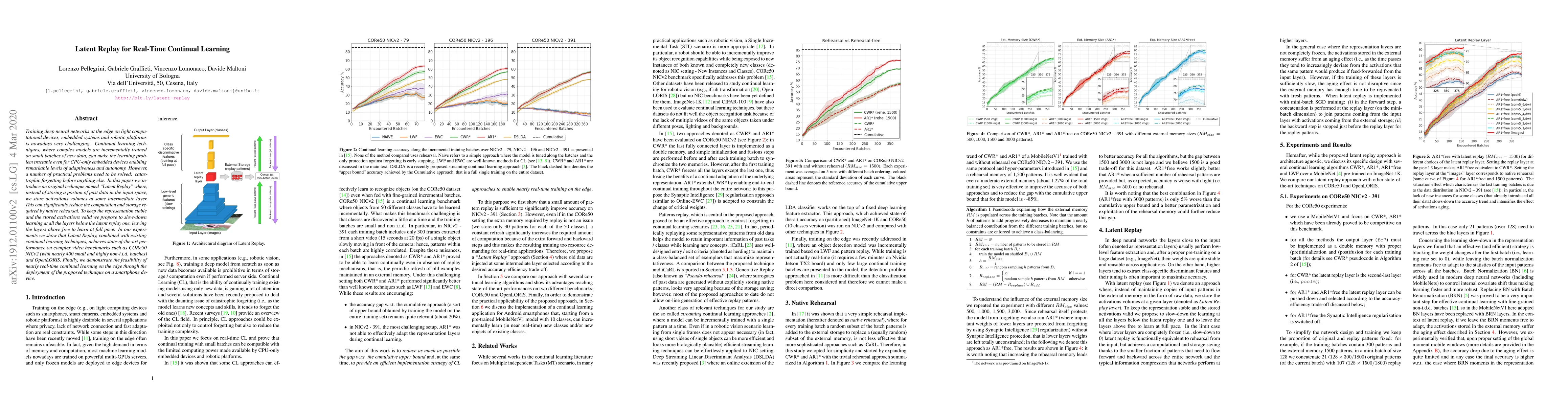 This paper introduces "Latent Replay," a novel technique for real-time continual learning in edge devices, which stores activations from intermediate layers instead of raw data to mitigate catastrophic forgetting. The method slows down learning in lower layers while allowing upper layers to adapt fully, achieving state-of-the-art performance on video benchmarks and demonstrating real-time applicability on a smartphone.