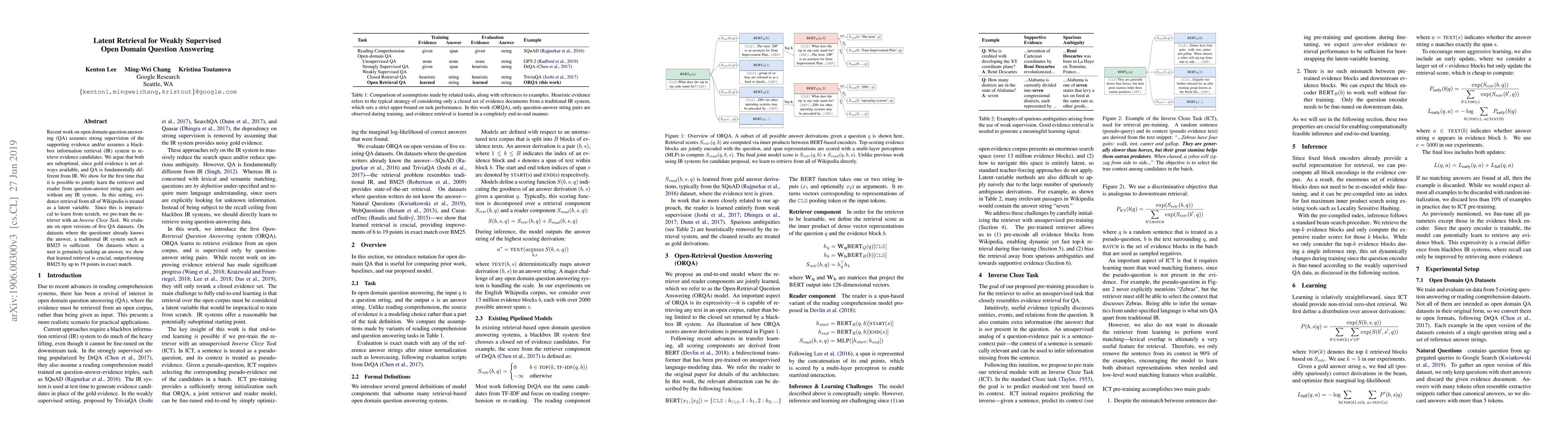 This paper proposes a method for weakly supervised open domain question answering (QA) that jointly learns a retriever and a reader from question-answer pairs without relying on a blackbox information retrieval system. The authors demonstrate that learned retrieval outperforms traditional IR methods like BM25, especially in scenarios where users genuinely seek answers.