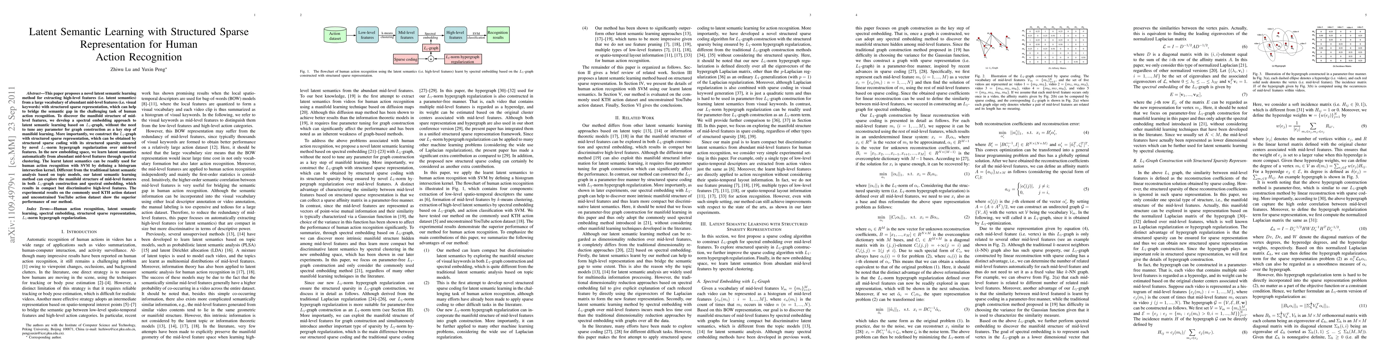 This paper introduces a novel latent semantic learning method using structured sparse representation to extract high-level features from mid-level visual keywords, aiming to bridge the semantic gap in human action recognition. The method leverages spectral embedding based on L1-graph and structured sparse coding with L1-norm hypergraph regularization, achieving superior performance on KTH and YouTube action datasets.
