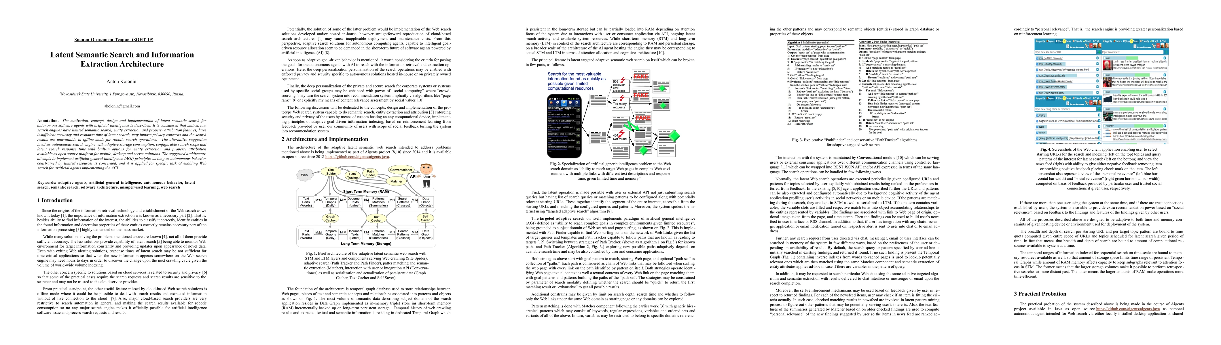The motivation, concept, design and implementation of latent semantic search for search engines have limited semantic search, entity extraction and property attribution features, have insufficient accuracy and response time of latent search, may impose privacy concerns and the search results are unavailable in offline mode for robotic search operations. The alternative suggestion involves autonomous search engine with adaptive storage consumption, configurable search scope and latent search response time with built-in options for entity extraction and property attribution available as open source platform for mobile, desktop and server solutions. The suggested architecture attempts to implement artificial general intelligence (AGI) principles as long as autonomous behaviour constrained by limited resources is concerned, and it is applied for specific task of enabling Web search for artificial agents implementing the AGI.