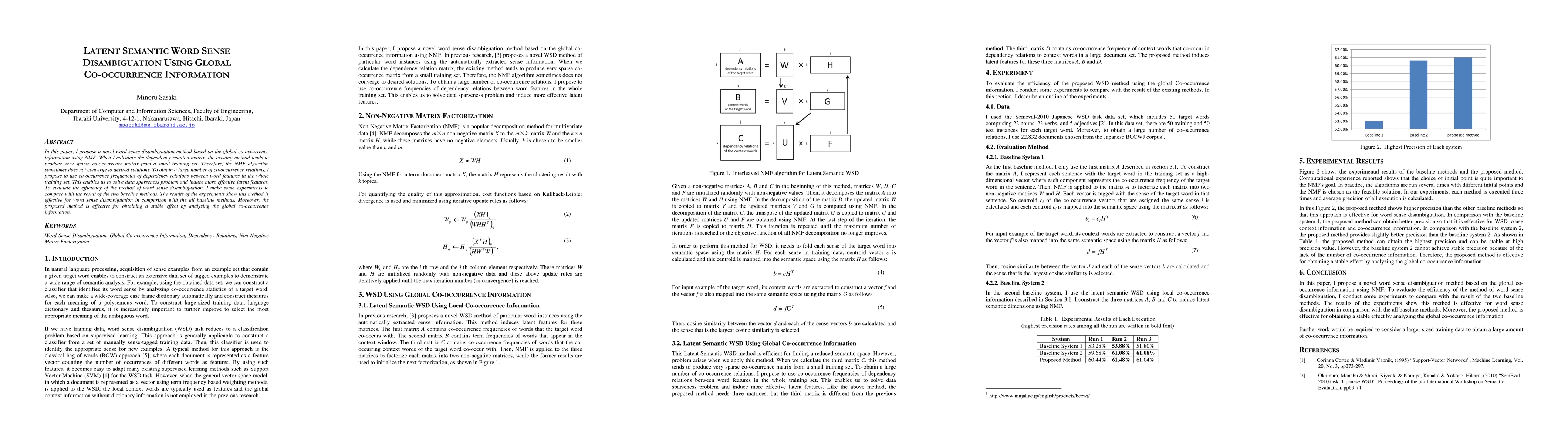 This paper introduces a new word sense disambiguation method leveraging global co-occurrence information and Non-negative Matrix Factorization (NMF) to address data sparsity issues. The proposed approach uses co-occurrence frequencies of dependency relations from a full training set, leading to more effective latent features and outperforming baseline methods in experiments.