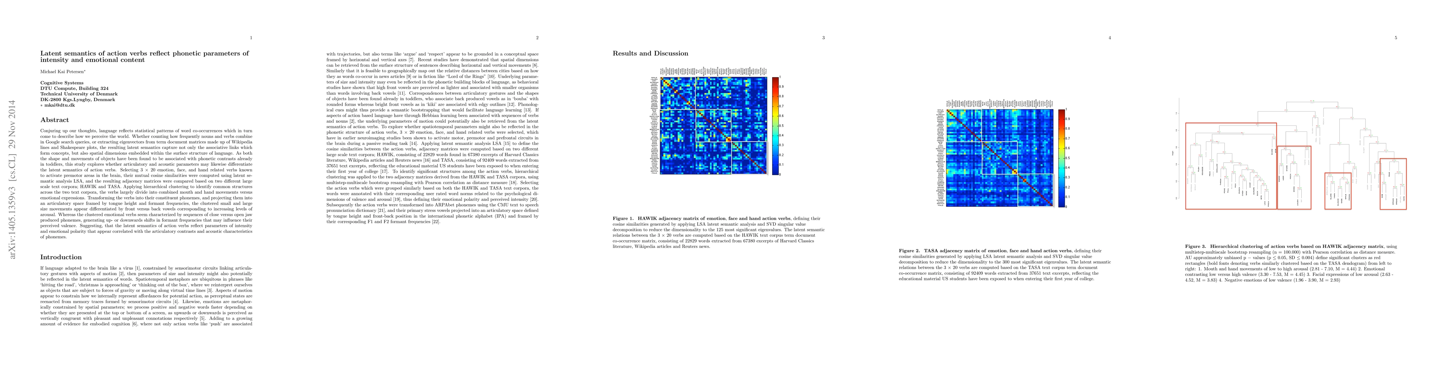 Conjuring up our thoughts, language reflects statistical patterns of word co-occurrences which in turn come to describe how we perceive the world. Whether counting how frequently nouns and verbs combine in Google search queries, or extracting eigenvectors from term document matrices made up of Wikipedia lines and Shakespeare plots, the resulting latent semantics capture not only the associative links which form concepts, but also spatial dimensions embedded within the surface structure of language. As both the shape and movements of objects have been found to be associated with phonetic contrasts already in toddlers, this study explores whether articulatory and acoustic parameters may likewise differentiate the latent semantics of action verbs. Selecting 3 x 20 emotion, face, and hand related verbs known to activate premotor areas in the brain, their mutual cosine similarities were computed using latent semantic analysis LSA, and the resulting adjacency matrices were compared based on two different large scale text corpora; HAWIK and TASA. Applying hierarchical clustering to identify common structures across the two text corpora, the verbs largely divide into combined mouth and hand movements versus emotional expressions. Transforming the verbs into their constituent phonemes, the clustered small and large size movements appear differentiated by front versus back vowels corresponding to increasing levels of arousal. Whereas the clustered emotional verbs seem characterized by sequences of close versus open jaw produced phonemes, generating up- or downwards shifts in formant frequencies that may influence their perceived valence. Suggesting, that the latent semantics of action verbs reflect parameters of intensity and emotional polarity that appear correlated with the articulatory contrasts and acoustic characteristics of phonemes