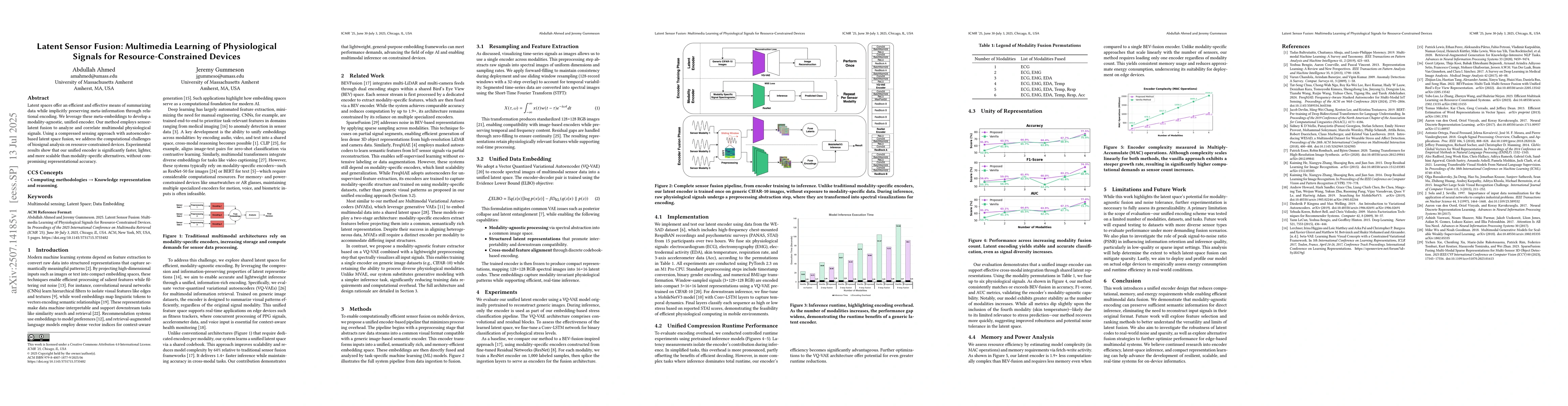 Latent spaces offer an efficient and effective means of summarizing data while implicitly preserving meta-information through relational encoding. We leverage these meta-embeddings to develop a modality-agnostic, unified encoder. Our method employs sensor-latent fusion to analyze and correlate multimodal physiological signals. Using a compressed sensing approach with autoencoder-based latent space fusion, we address the computational challenges of biosignal analysis on resource-constrained devices. Experimental results show that our unified encoder is significantly faster, lighter, and more scalable than modality-specific alternatives, without compromising representational accuracy.