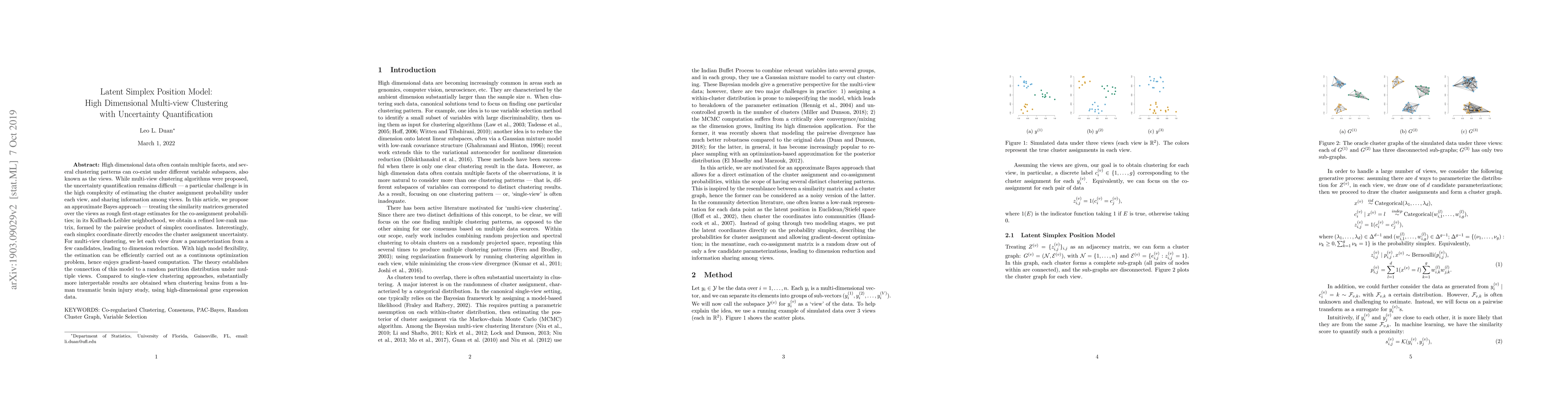 This paper proposes an advanced multi-view clustering method using a latent simplex position model that incorporates uncertainty quantification through an approximate Bayesian approach. The method refines similarity matrices to estimate cluster assignment probabilities and achieves dimension reduction by allowing each view to select from a few parameterization candidates.