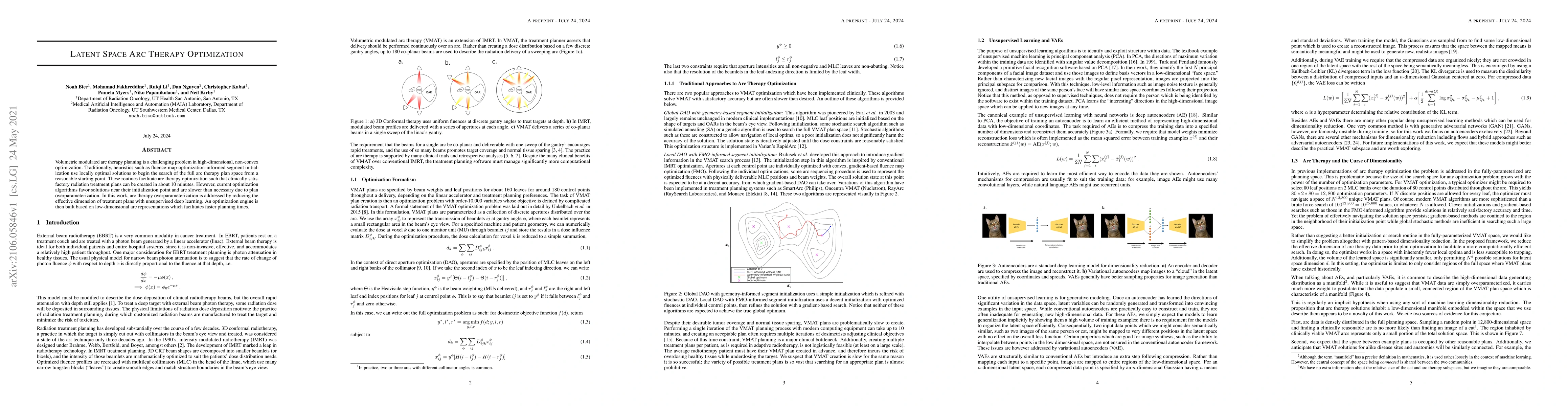 This paper proposes an optimization method for volumetric modulated arc therapy planning using unsupervised deep learning to reduce the effective dimension of treatment plans. This approach enables faster planning times by creating low-dimensional representations of arc therapy plans, moving beyond traditional heuristics that rely on local optimization.