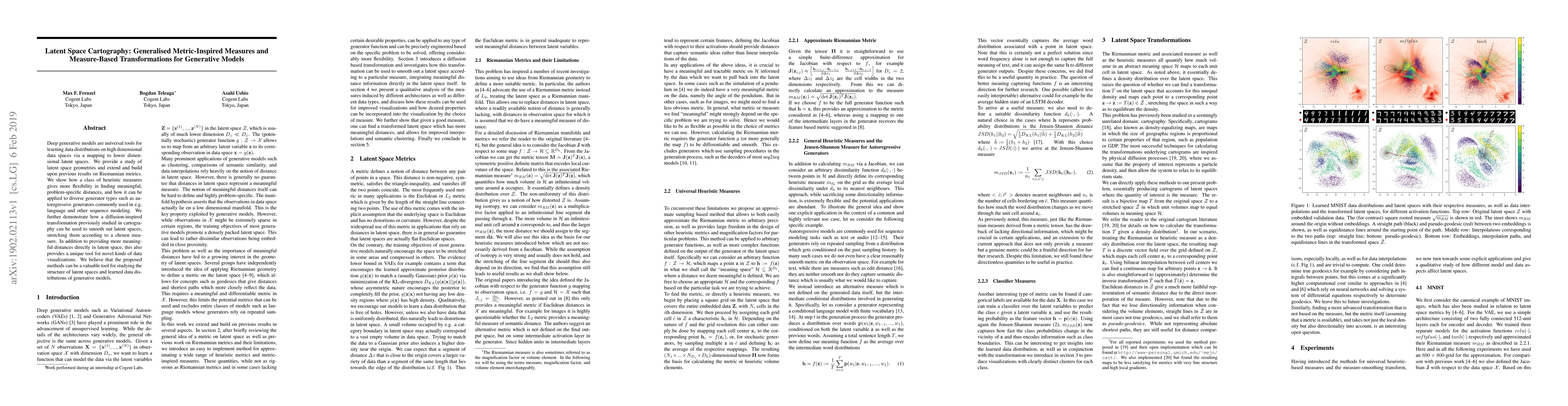 Deep generative models are universal tools for learning data distributions on high dimensional data spaces via a mapping to lower dimensional latent spaces. We provide a study of latent space geometries and extend and build upon previous results on Riemannian metrics. We show how a class of heuristic measures gives more flexibility in finding meaningful, problem-specific distances, and how it can be applied to diverse generator types such as autoregressive generators commonly used in e.g. language and other sequence modeling. We further demonstrate how a diffusion-inspired transformation previously studied in cartography can be used to smooth out latent spaces, stretching them according to a chosen measure. In addition to providing more meaningful distances directly in latent space, this also provides a unique tool for novel kinds of data visualizations. We believe that the proposed methods can be a valuable tool for studying the structure of latent spaces and learned data distributions of generative models.