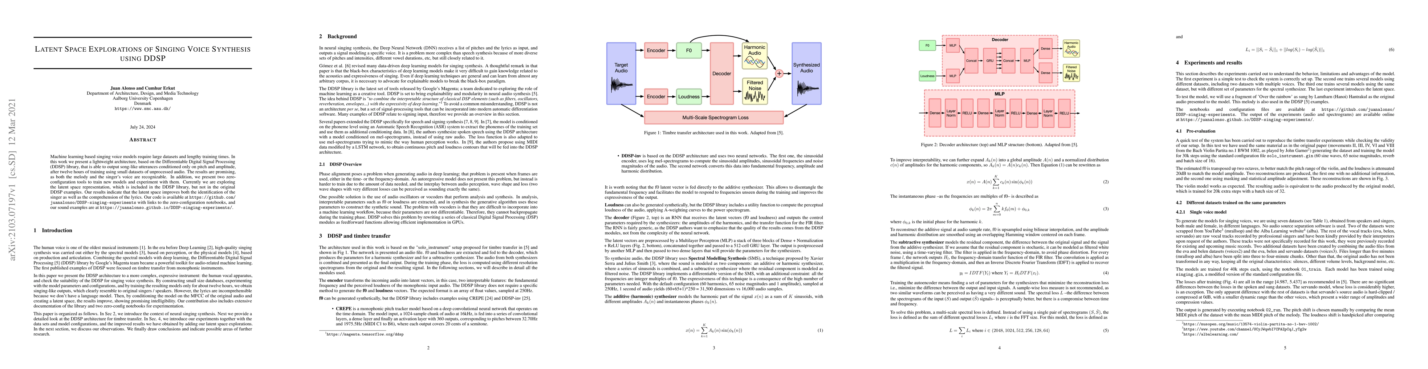 This paper introduces a lightweight singing voice synthesis model using DDSP, achieving recognizable melodies and voices from small datasets in 12 hours. The study explores the latent space of DDSP, finding it enhances singer identification and lyric comprehension.