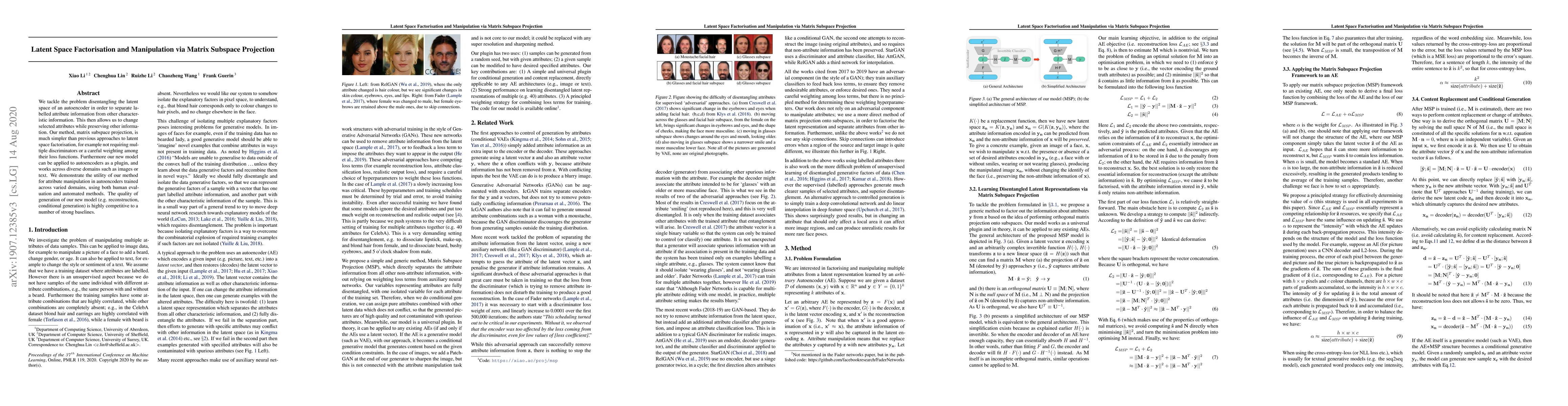 This paper proposes a matrix subspace projection method for disentangling the latent space of autoencoders, allowing for attribute manipulation while preserving other information. Unlike previous methods, it requires no discriminators or complex loss functions, and demonstrates competitive performance across diverse domains.