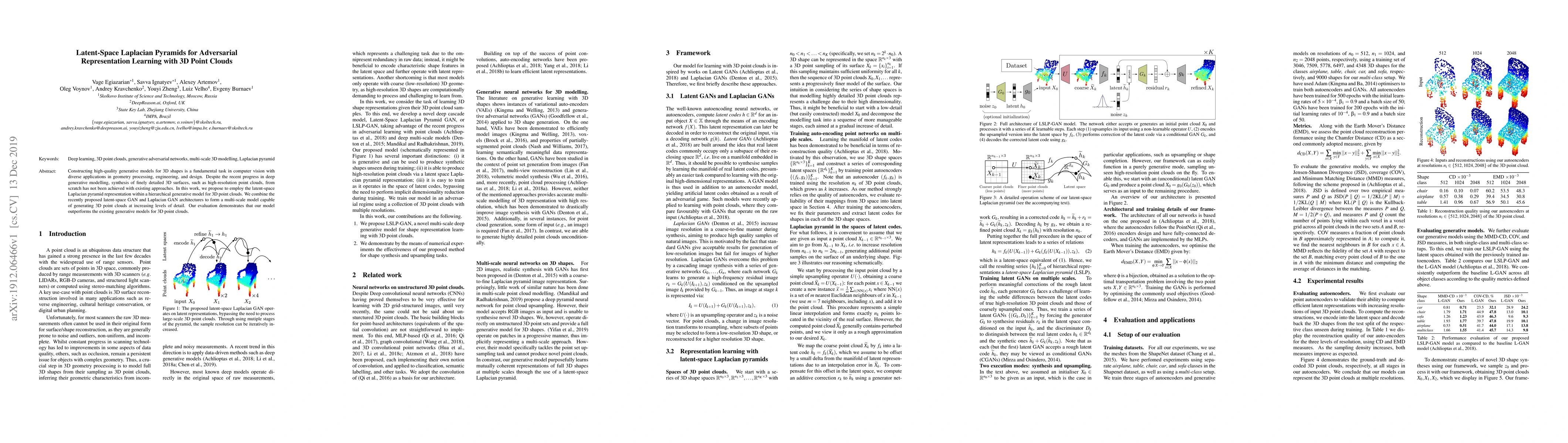 This paper proposes a hierarchical generative model using latent-space Laplacian pyramids for synthesizing high-resolution 3D point clouds. The model combines latent-space GAN and Laplacian GAN architectures to generate 3D shapes at multiple levels of detail, outperforming existing methods.