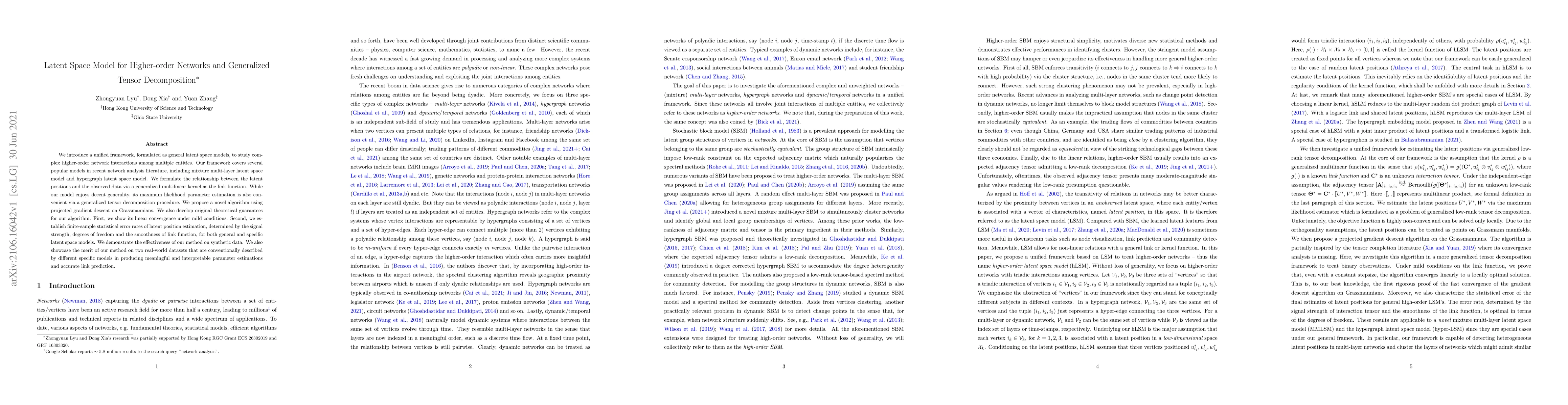 We introduce a unified framework, formulated as general latent space models, to study complex higher-order network interactions among multiple entities. Our framework covers several popular models in recent network analysis literature, including mixture multi-layer latent space model and hypergraph latent space model. We formulate the relationship between the latent positions and the observed data via a generalized multilinear kernel as the link function. While our model enjoys decent generality, its maximum likelihood parameter estimation is also convenient via a generalized tensor decomposition procedure.We propose a novel algorithm using projected gradient descent on Grassmannians. We also develop original theoretical guarantees for our algorithm. First, we show its linear convergence under mild conditions. Second, we establish finite-sample statistical error rates of latent position estimation, determined by the signal strength, degrees of freedom and the smoothness of link function, for both general and specific latent space models. We demonstrate the effectiveness of our method on synthetic data. We also showcase the merit of our method on two real-world datasets that are conventionally described by different specific models in producing meaningful and interpretable parameter estimations and accurate link prediction. We demonstrate the effectiveness of our method on synthetic data. We also showcase the merit of our method on two real-world datasets that are conventionally described by different specific models in producing meaningful and interpretable parameter estimations and accurate link prediction.