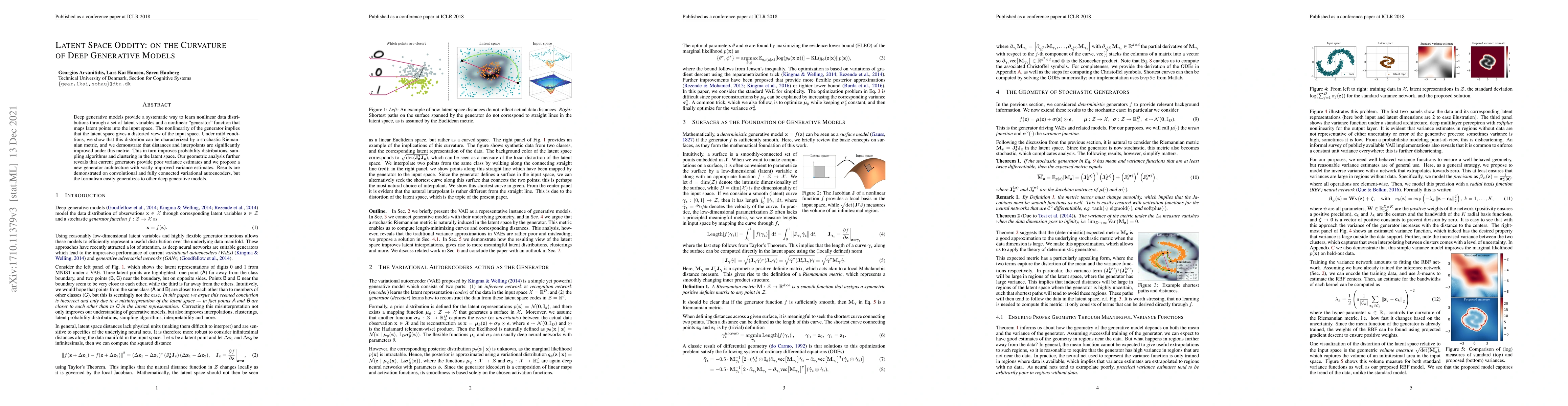 This paper investigates the curvature of the latent space in deep generative models, showing that it can be characterized by a stochastic Riemannian metric, leading to improved distances and interpolation. The authors propose a new generator architecture that provides better variance estimates, enhancing probability distributions, sampling, and clustering.