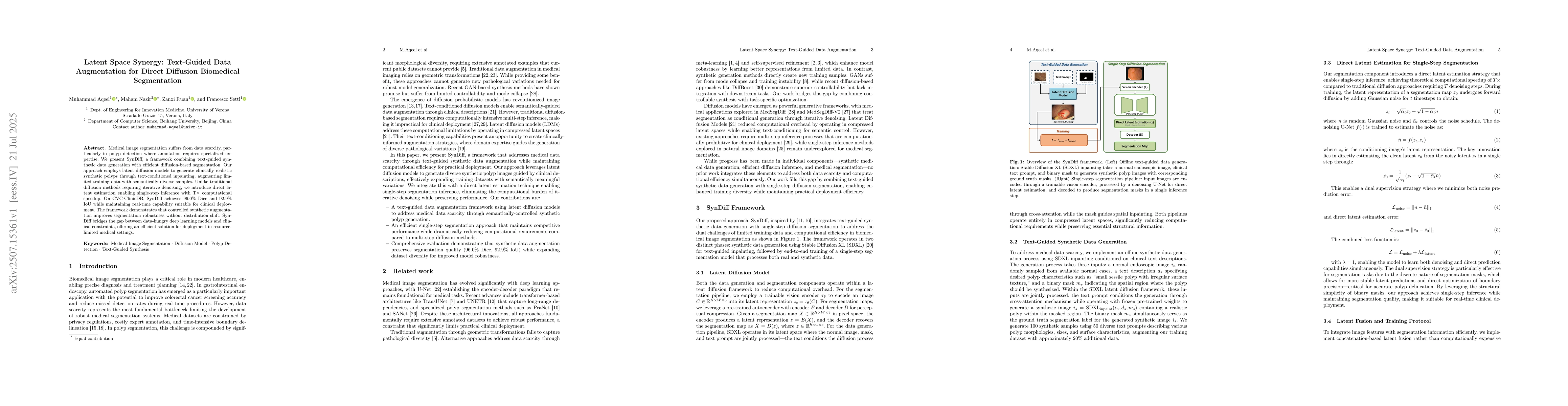 Medical image segmentation suffers from data scarcity, particularly in polyp detection where annotation requires specialized expertise. We present SynDiff, a framework combining text-guided synthetic data generation with efficient diffusion-based segmentation. Our approach employs latent diffusion models to generate clinically realistic synthetic polyps through text-conditioned inpainting, augmenting limited training data with semantically diverse samples. Unlike traditional diffusion methods requiring iterative denoising, we introduce direct latent estimation enabling single-step inference with T x computational speedup. On CVC-ClinicDB, SynDiff achieves 96.0% Dice and 92.9% IoU while maintaining real-time capability suitable for clinical deployment. The framework demonstrates that controlled synthetic augmentation improves segmentation robustness without distribution shift. SynDiff bridges the gap between data-hungry deep learning models and clinical constraints, offering an efficient solution for deployment in resourcelimited medical settings.