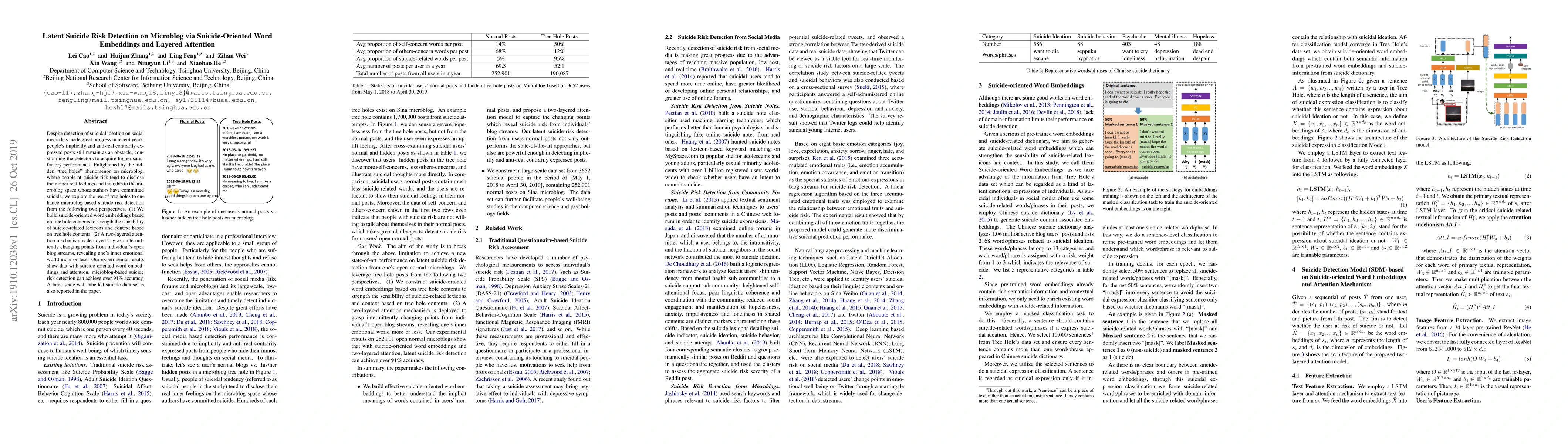 This paper develops a method for detecting latent suicide risk on microblogs using suicide-oriented word embeddings and a two-layered attention mechanism. The embeddings enhance the detection of suicide-related lexicons, while the attention mechanism identifies emotional changes in users' posts, achieving over 91% accuracy in risk detection.
