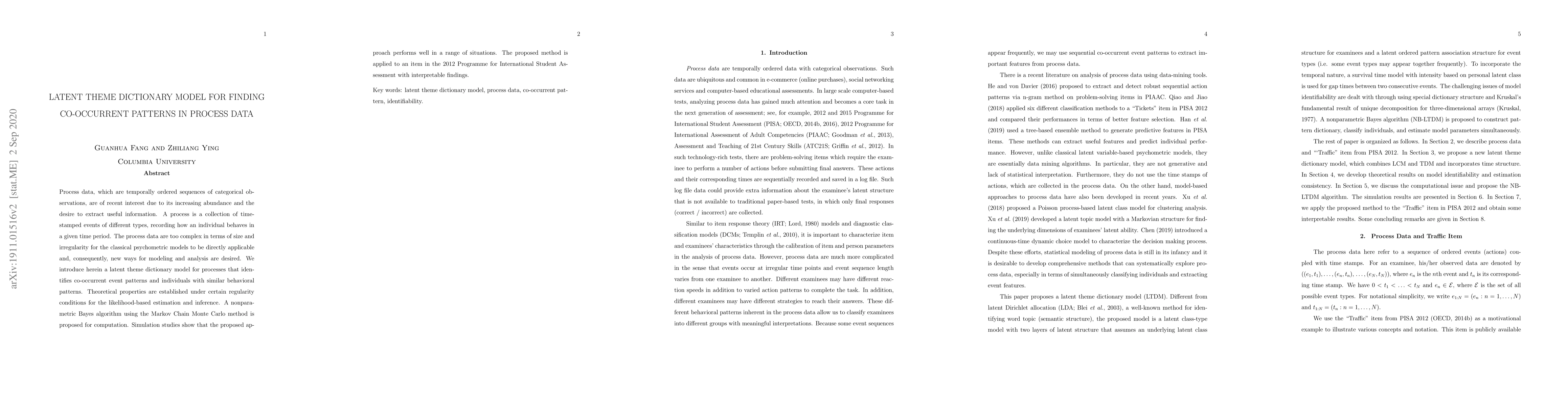A new approach to analyzing complex process data is proposed using a latent theme dictionary model that identifies co-occurrent event patterns and similar behavioral patterns in individuals. The method shows promise through simulation studies and has been applied to real-world data with interpretable findings.