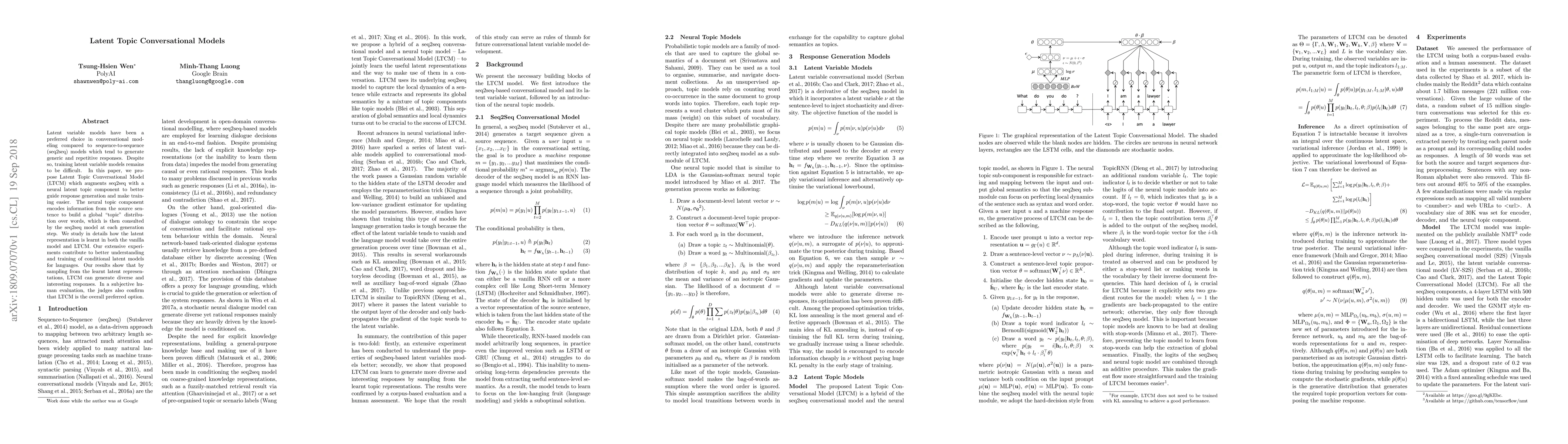This paper proposes a Latent Topic Conversational Model (LTCM) that combines seq2seq with a neural latent topic component to enhance response generation and simplify training. LTCM generates diverse and interesting responses, as confirmed by human evaluation.