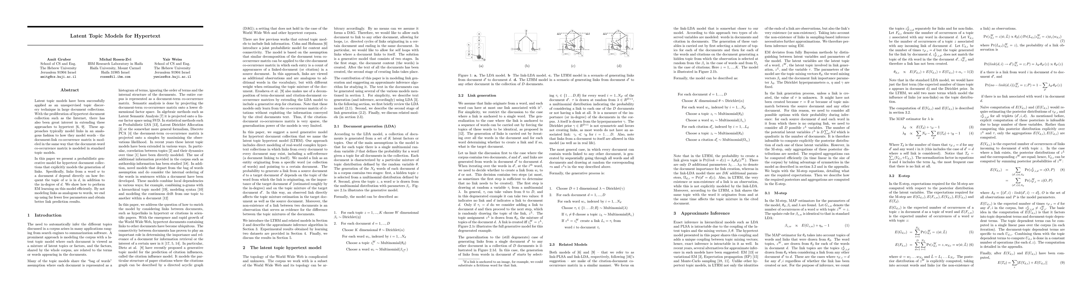 This paper introduces a probabilistic generative model for hypertext that explicitly models link generation, differing from traditional topic models by directly linking word topics to document links. The authors demonstrate efficient EM learning and show improved link prediction results by using fewer free parameters.