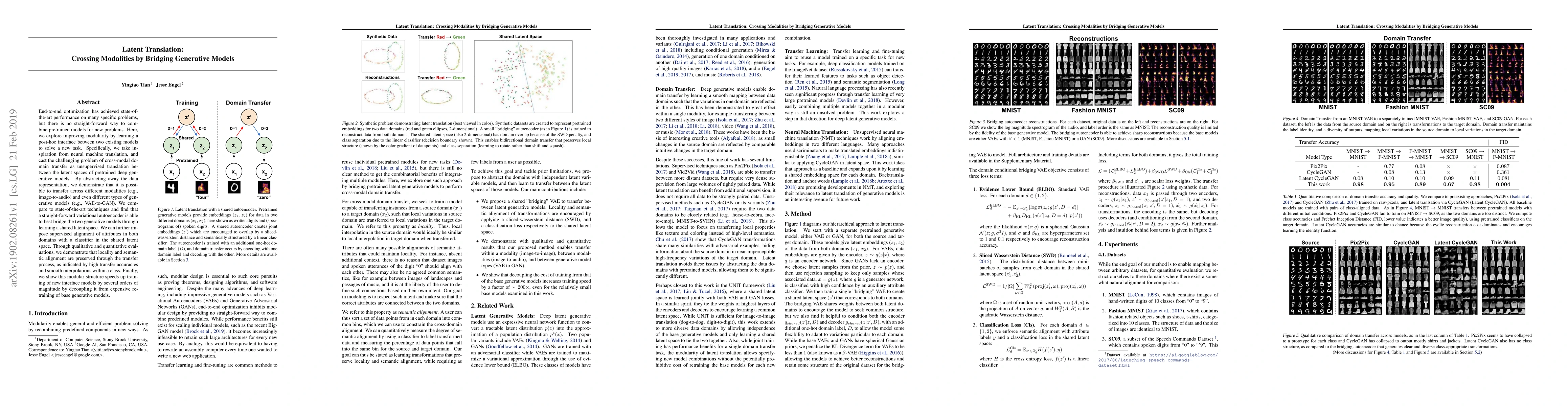 End-to-end optimization has achieved state-of-the-art performance on many specific problems, but there is no straight-forward way to combine pretrained models for new problems. Here, we explore improving modularity by learning a post-hoc interface between two existing models to solve a new task. Specifically, we take inspiration from neural machine translation, and cast the challenging problem of cross-modal domain transfer as unsupervised translation between the latent spaces of pretrained deep generative models. By abstracting away the data representation, we demonstrate that it is possible to transfer across different modalities (e.g., image-to-audio) and even different types of generative models (e.g., VAE-to-GAN). We compare to state-of-the-art techniques and find that a straight-forward variational autoencoder is able to best bridge the two generative models through learning a shared latent space. We can further impose supervised alignment of attributes in both domains with a classifier in the shared latent space. Through qualitative and quantitative evaluations, we demonstrate that locality and semantic alignment are preserved through the transfer process, as indicated by high transfer accuracies and smooth interpolations within a class. Finally, we show this modular structure speeds up training of new interface models by several orders of magnitude by decoupling it from expensive retraining of base generative models.