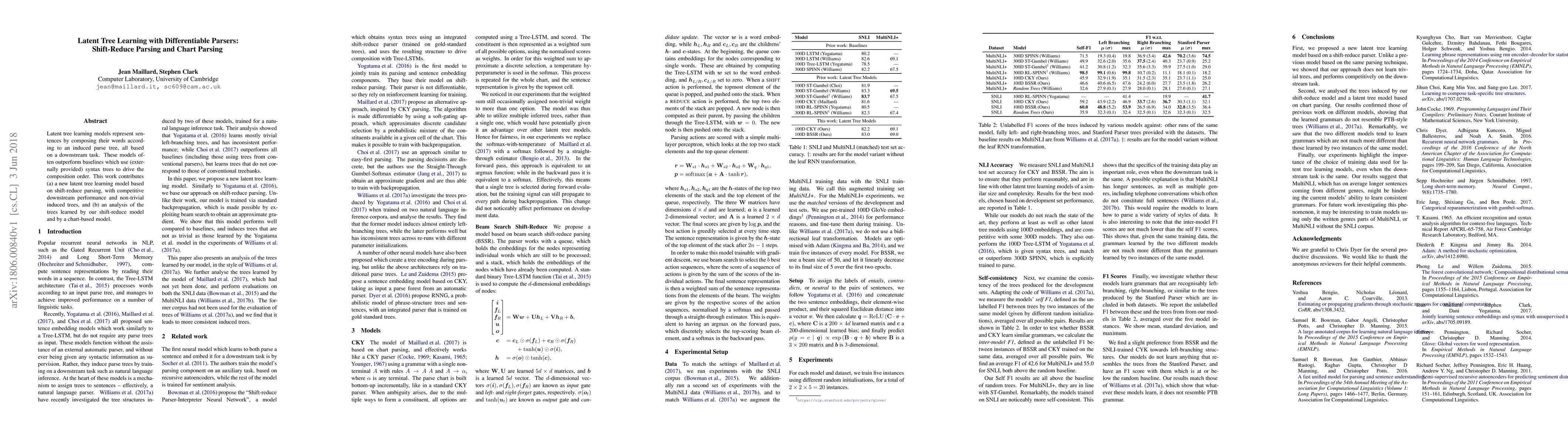 Latent tree learning models represent sentences by composing their words according to an induced parse tree, all based on a downstream task. These models often outperform baselines which use (externally provided) syntax trees to drive the composition order. This work contributes (a) a new latent tree learning model based on shift-reduce parsing, with competitive downstream performance and non-trivial induced trees, and (b) an analysis of the trees learned by our shift-reduce model and by a chart-based model.