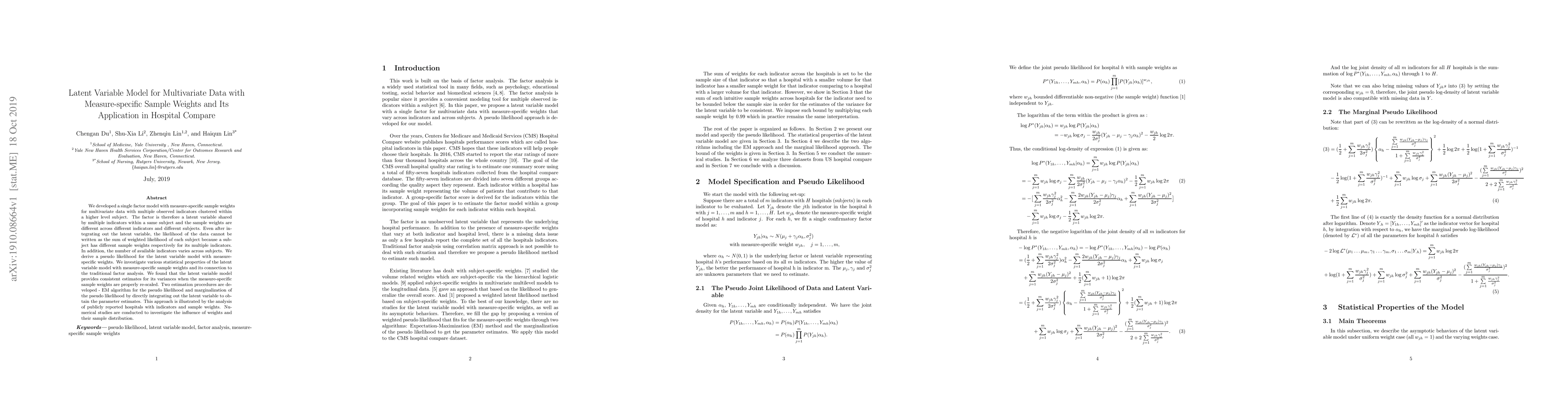 This paper develops a latent variable model for multivariate data with measure-specific sample weights, deriving a pseudo likelihood for estimation. The model is applied to Hospital Compare data, demonstrating consistent variance estimates and introducing two estimation procedures: EM algorithm and marginalization.