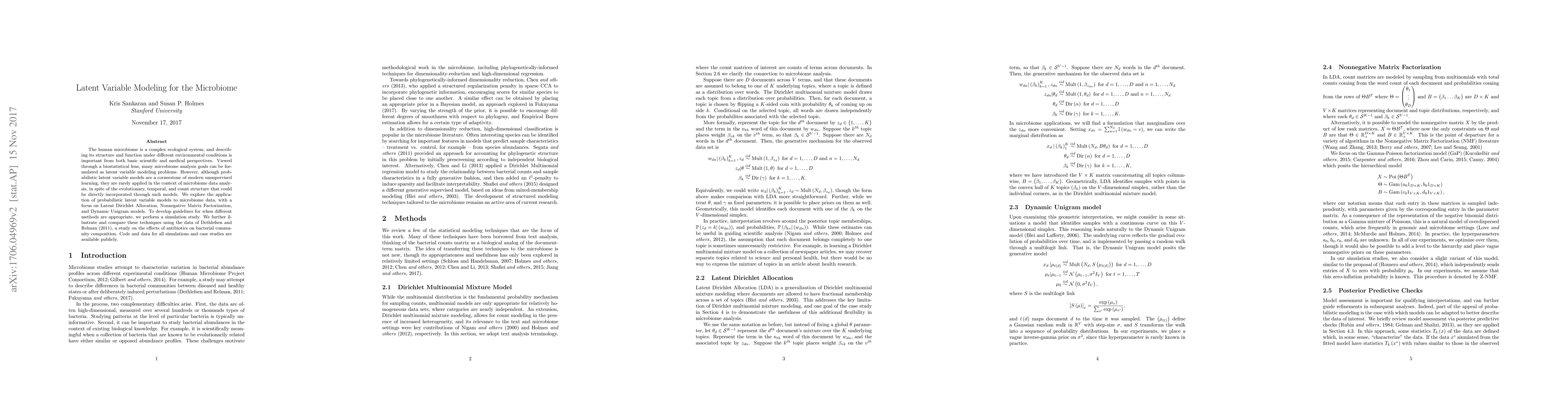 The human microbiome is a complex ecological system, and describing its structure and function under different environmental conditions is important from both basic scientific and medical perspectives. Viewed through a biostatistical lens, many microbiome analysis goals can be formulated as latent variable modeling problems. However, although probabilistic latent variable models are a cornerstone of modern unsupervised learning, they are rarely applied in the context of microbiome data analysis, in spite of the evolutionary, temporal, and count structure that could be directly incorporated through such models. We explore the application of probabilistic latent variable models to microbiome data, with a focus on Latent Dirichlet Allocation, Nonnegative Matrix Factorization, and Dynamic Unigram models. To develop guidelines for when different methods are appropriate, we perform a simulation study. We further illustrate and compare these techniques using the data of [10], a study on the effects of antibiotics on bacterial community composition. Code and data for all simulations and case studies are available publicly.