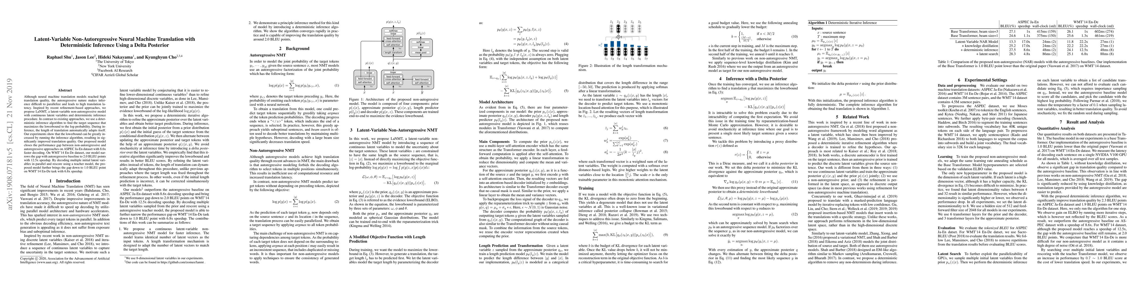The paper proposes LaNMT, a latent-variable non-autoregressive neural machine translation model with deterministic inference, achieving significantly improved translation quality and 8.6x faster decoding speed compared to autoregressive models on ASPEC Ja-En dataset. The model narrows the performance gap on WMT'14 En-De dataset, achieving a 1.0 BLEU point improvement with 6.8x speedup.