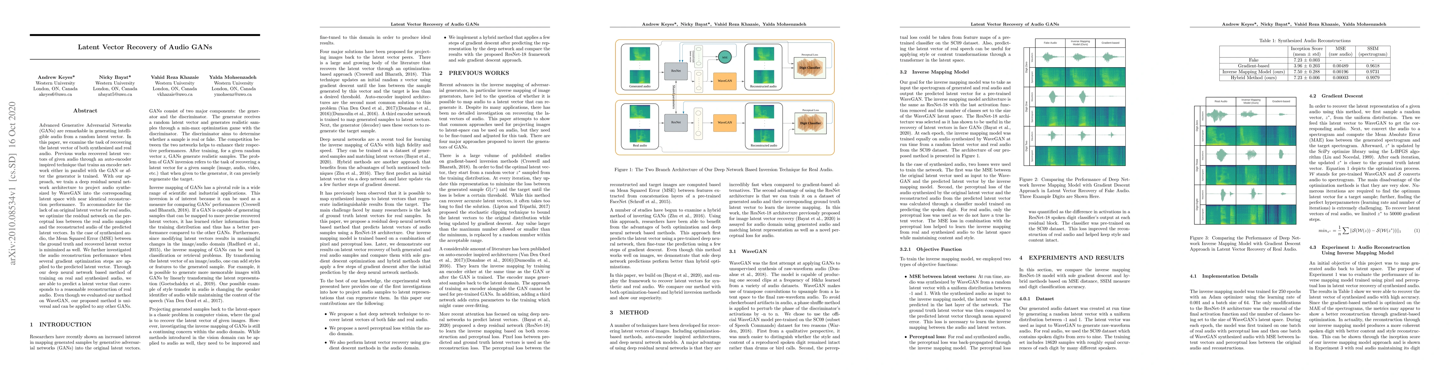 This paper proposes a deep residual neural network to recover latent vectors from both synthesized and real audio generated by GANs. It optimizes the network using perceptual loss for real audio and Mean Squared Error for synthesized audio, achieving near-identical reconstruction performance.