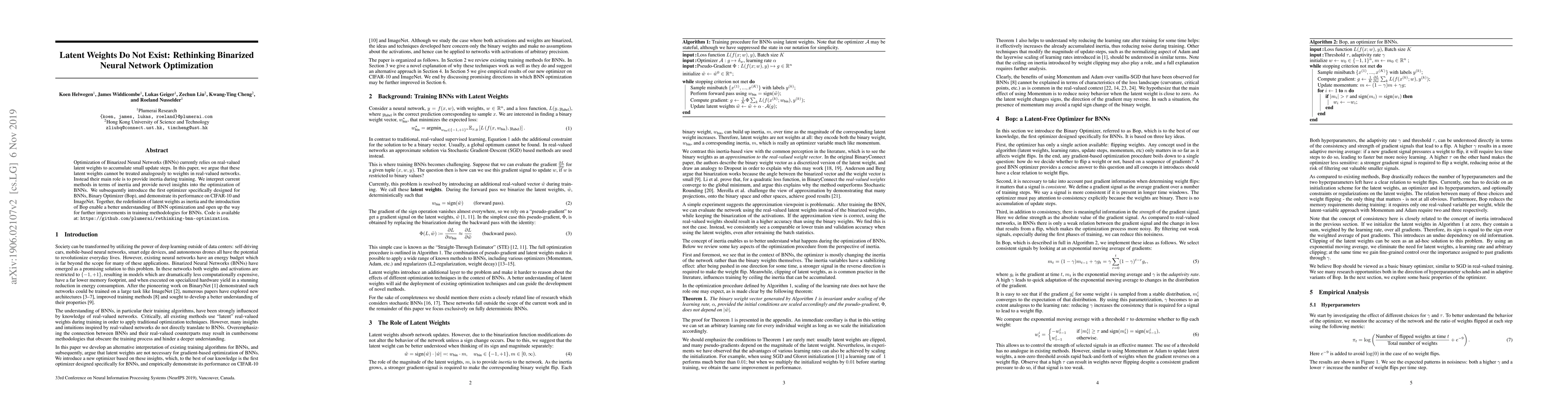 This paper argues that latent weights in Binarized Neural Networks (BNNs) function primarily as inertia rather than as traditional weights, and introduces the Binary Optimizer (Bop) tailored for BNNs. This new perspective and the Bop optimizer improve BNN training methodologies.