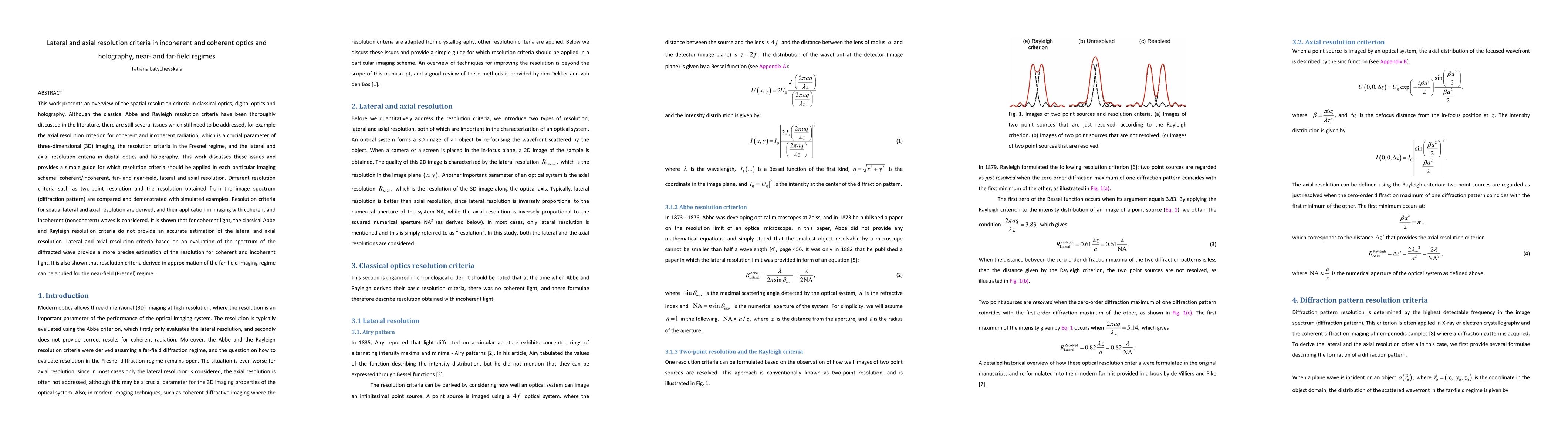 This paper reviews spatial resolution criteria in classical, digital optics, and holography, emphasizing the axial resolution for coherent and incoherent radiation. It proposes refined criteria for lateral and axial resolution, demonstrating that classical Abbe and Rayleigh criteria are insufficient for coherent light, while spectrum-based criteria offer more precise resolution estimates.