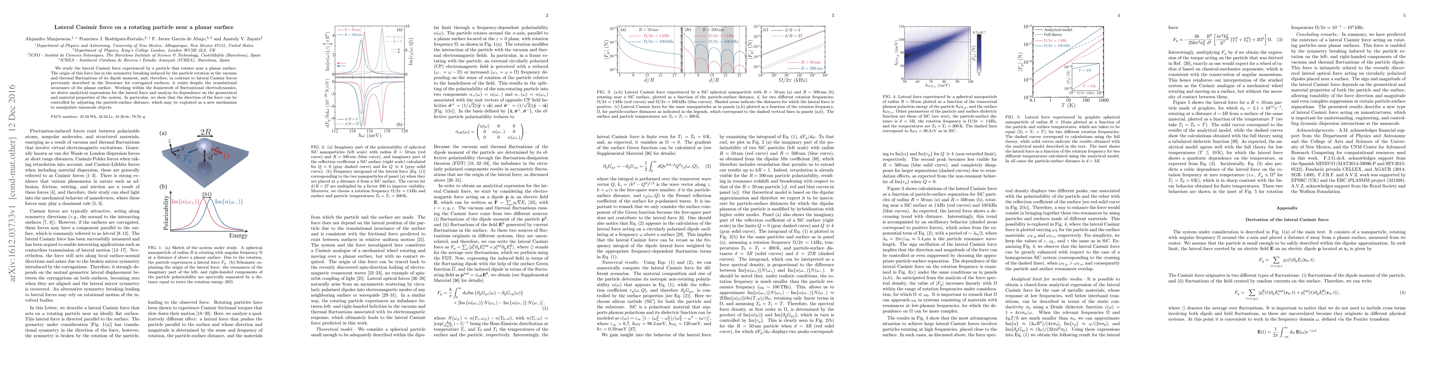 This paper investigates the lateral Casimir force on a rotating particle near a planar surface, deriving analytical expressions that reveal its dependence on geometrical and material properties. The force arises from the symmetry breaking due to the particle's rotation and can be controlled by adjusting the particle-surface distance, offering a novel method for manipulating nanoscale objects.