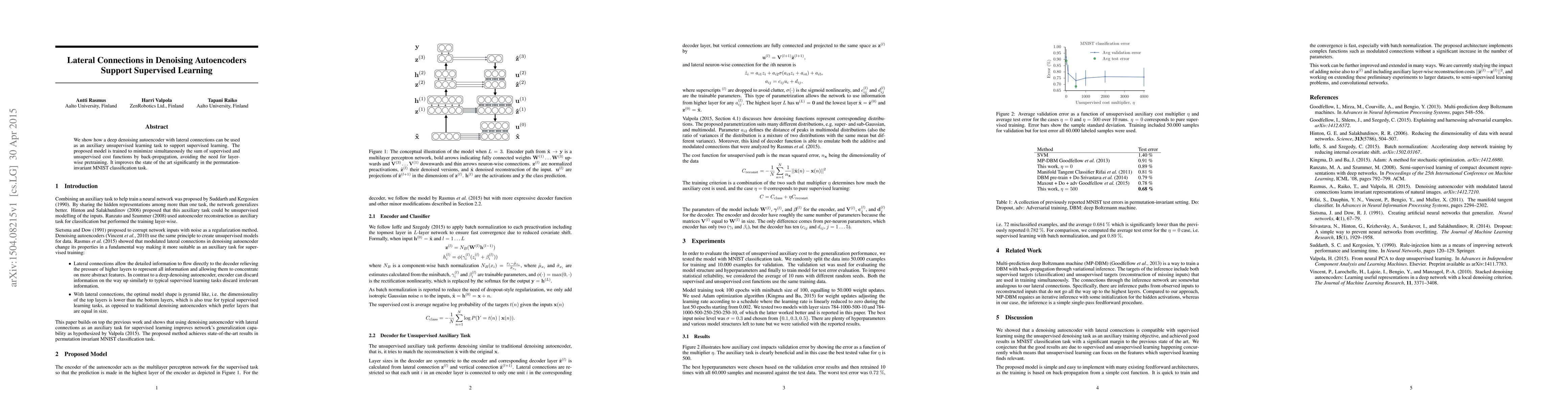 This paper demonstrates that a deep denoising autoencoder with lateral connections can enhance supervised learning by serving as an auxiliary unsupervised learning task. The model effectively combines supervised and unsupervised training through back-propagation, achieving superior performance in the MNIST classification task.