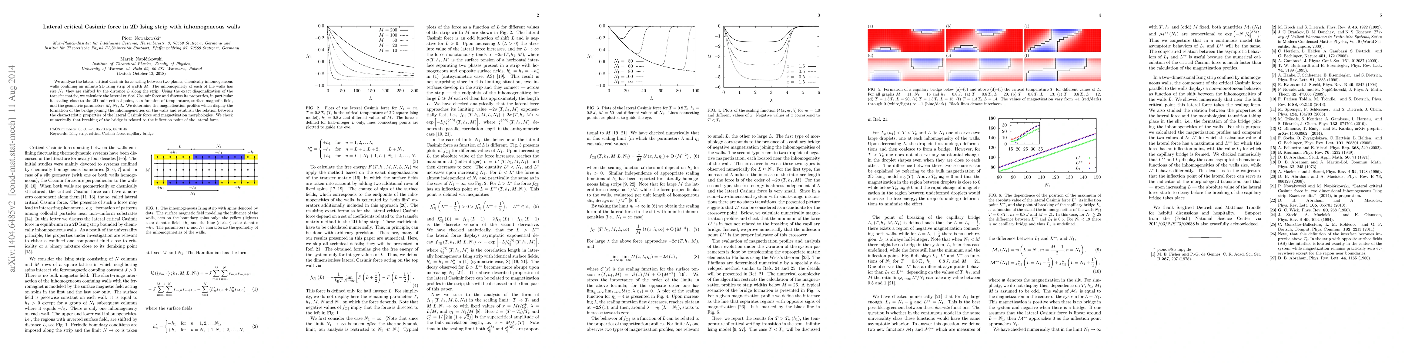 This paper investigates the lateral critical Casimir force between two inhomogeneous walls confining a 2D Ising strip, calculating it via transfer matrix diagonalization. It examines the force's scaling behavior near the 2D critical point, linking it to magnetization profiles and the breaking of a bridge formed between wall inhomogeneities.
