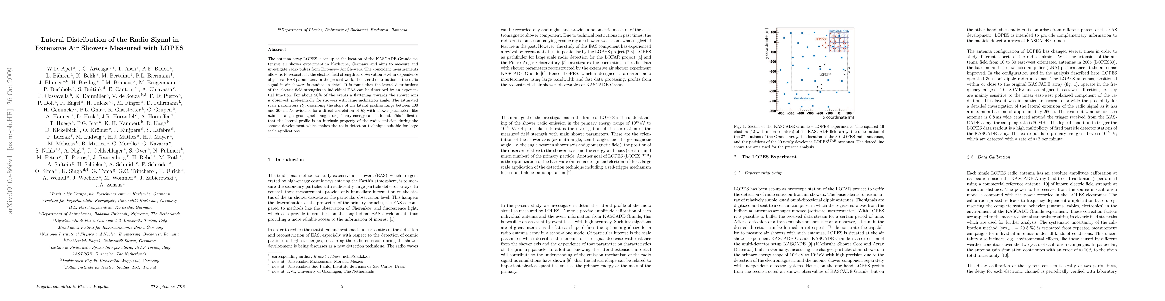 The LOPES antenna array in Karlsruhe measures radio signals from extensive air showers, finding that their lateral electric field distributions follow an exponential function. About 20% of events show a flattening towards the shower axis, especially for large inclination angles, indicating the radio detection technique's suitability for large-scale applications.