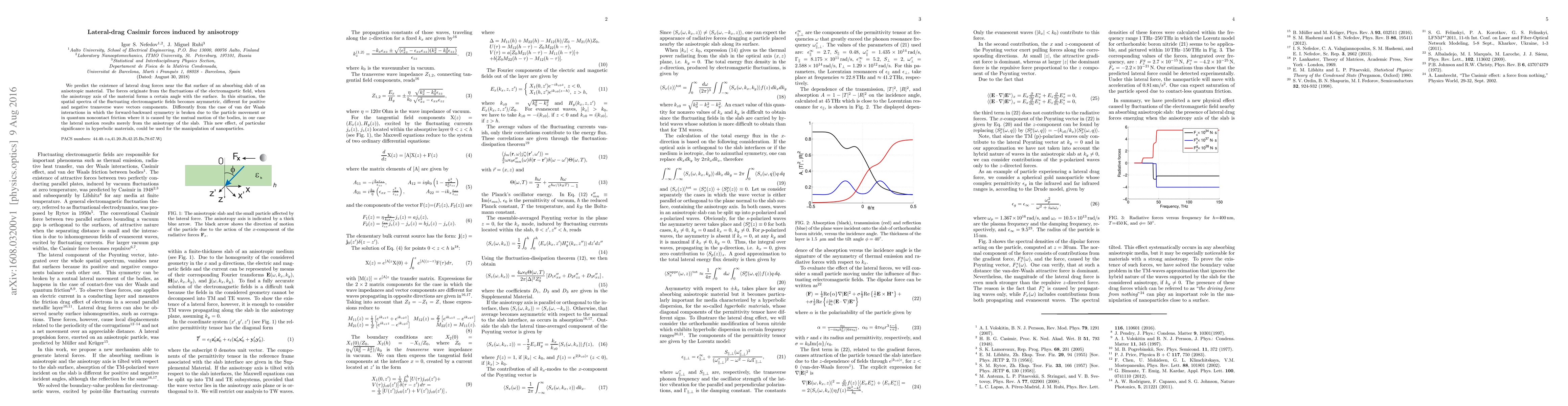 We predict the existence of lateral drag forces near the flat surface of an absorbing slab of an anisotropic material. The forces originate from the fluctuations of the electromagnetic field, when the anisotropy axis of the material forms a certain angle with the surface. In this situation, the spatial spectra of the fluctuating electromagnetic fields becomes asymmetric, different for positive and negative transverse wave vectors components. Differently from the case of van der Waals interactions in which the forward-backward symmetry is broken due to the particle movement or in quantum noncontact friction where it is caused by the mutual motion of the bodies, in our case the lateral motion results merely from the anisotropy of the slab. This new effect, of particular significance in hyperbolic materials, could be used for the manipulation of nanoparticles.