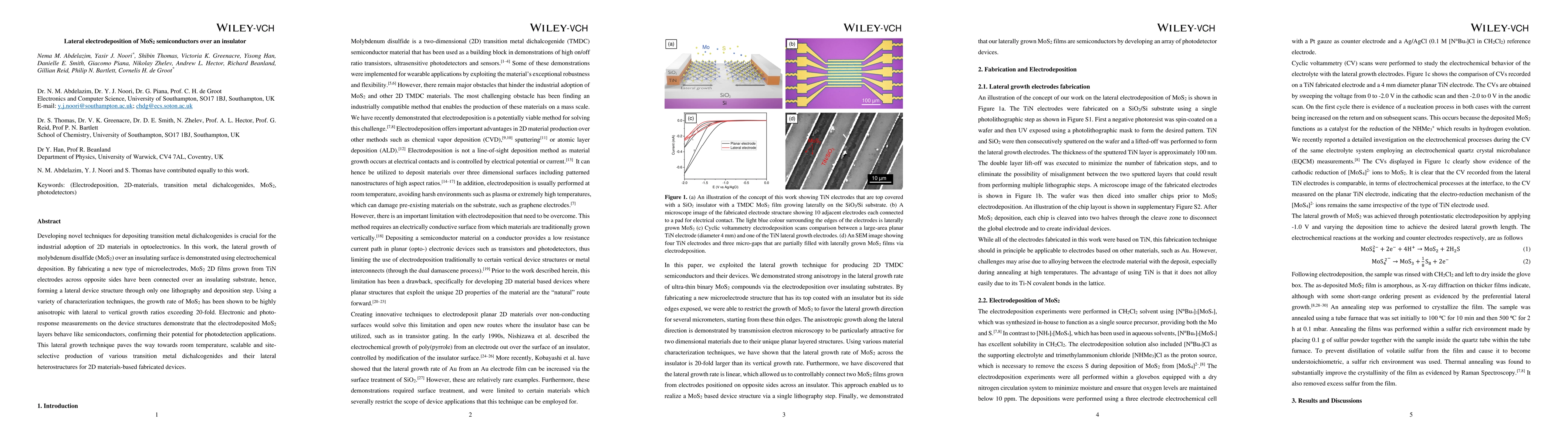 This paper demonstrates a novel electrochemical deposition technique for laterally growing MoS2 semiconductor films over insulating surfaces, achieving high anisotropy and confirming their semiconducting properties for photodetection applications. The method enables scalable, site-selective production of 2D transition metal dichalcogenides for advanced optoelectronic devices.
